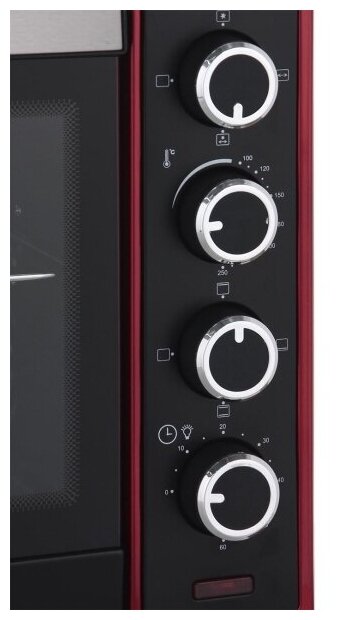 | Мини-печь имеет механическое управление с 4 поворотными регуляторами | регулятор температуры от 100 до 250С, таймер до 60 мин, регулятор режимов работы духовки 3-мя с различными сочетаниями нагревательных элементов сверху и снизу, регулятор программ духовки с 3-мя различными сочетаниями конвекции и вертела. |