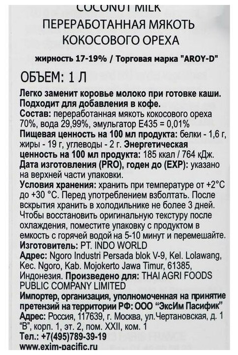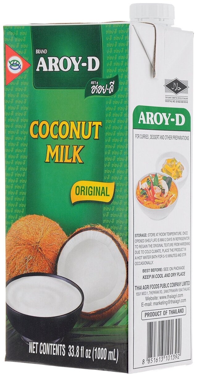 Описание товара:Кокосовое молоко Aroy-D 70% (жирность 17-19%) 250 мл. Кокосовое молоко, полученное из мякоти созревшего кокоса, используется в приготовлении супов, десертов, коктейлей, часто применяется для смягчения остроты. Является альтернативой коровьему молоку.Состав товара:Переработанная мякоть кокосового ореха 70%, вода 30%.Способ приготовления:Перед употреблением взболтать. Чтобы восстановить оригинальную текстуру после охлаждения, поместите упаковку с продуктом в ёмкость с горячей водой на 5-10 минут и перемешайте.Меры предосторожности:После вскрытия хранить не более 3 дней.