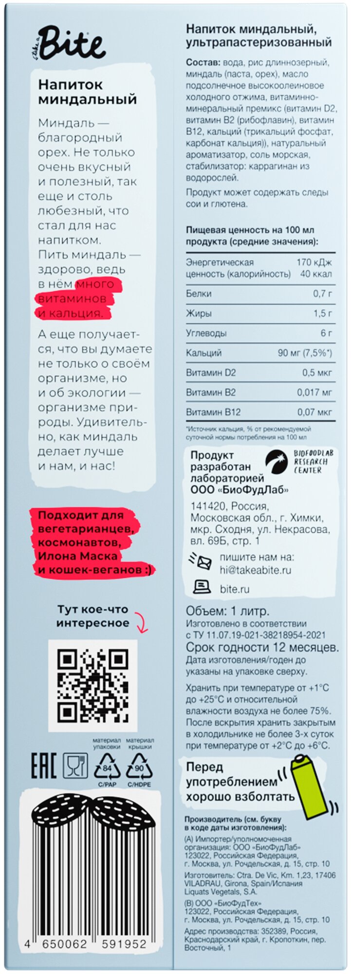Сервис сравнения цен СкидкаГИД предлагает сравнить цены на товар «Напиток миндальный Bite 1л TAKE A Bite»