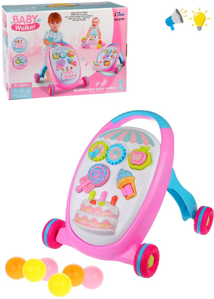Игрушка хорошая, пластик качественный и крепкий (ходунки, как только не летали, особенно тортик), но всё же это скорее игровой центр нежели ходунки, когда ребёнок на них переносит вес тела они резко катятся вперед и ребёнку нужна помощь родителей, что бы их придерживать. Впервые дала сыну когда он начал выползать из манежа, тогда особо не заинтересовала, а вот попозже уже стал проявлять интерес и до сих пор играет. На передней панели 2 несъёмные детали: шестерёнки и мороженое с тумблером и 3 съёмные: конфета-погремушка, яблоко-пищалка и тортик с музыкой и светом (тортик самый любимый) и что особенно радует батареек хватает очень надолго. Сзади есть большой карман с 6-ю пластиковыми шариками, колёса с резиновыми вставками. Но вот есть один значительный недостаток это бумажные наклейки, ребёнок всё облизывает и грызёт, а эти наклейки сразу размокают и оказываются у него во рту. Я решила их вообще смыть, но остался липкий клей, который ничем не растворяется, пришлось 2 игрушки убрать до лучших времён, но не уверена, что они потом будут интересны, всё-таки погремушка и пищалка это для самых маленьких. В целом игрушку рекомендую, но за такую цену наклейки должны быть другие или вообще без них.
