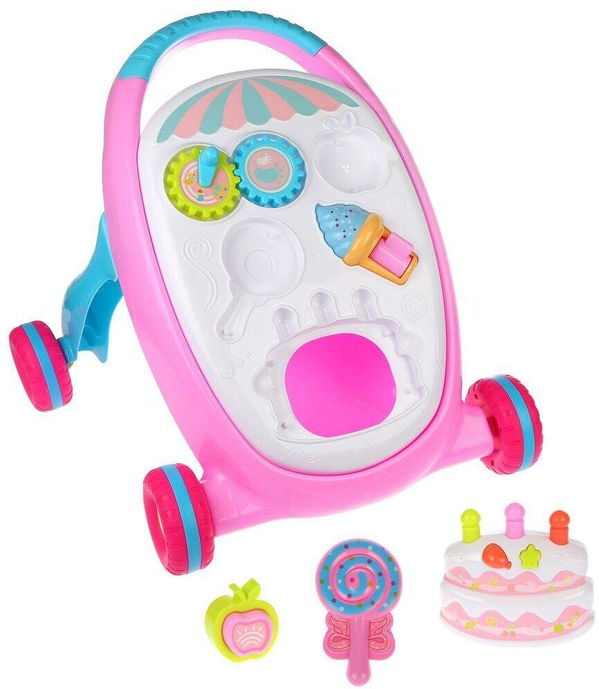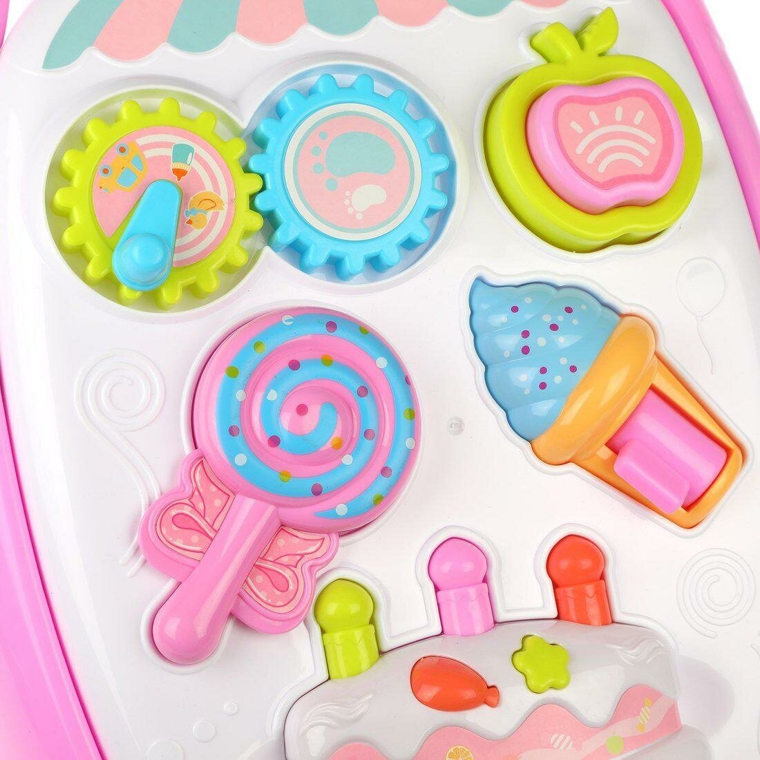 Малыш может толкать каталку вперёд перед собой или поиграть с развивающими элементами на передней панели: покрутить забавные шестерёнки, потрясти леденец-погремушку, понажимать на яблочко-пищалку, подвигать трескучий элемент на мороженом или, нажимая две кнопочки на тортике, послушать интересные звуки и весёлые мелодии, сопровождаемые красивой приглушенной подсветкой.