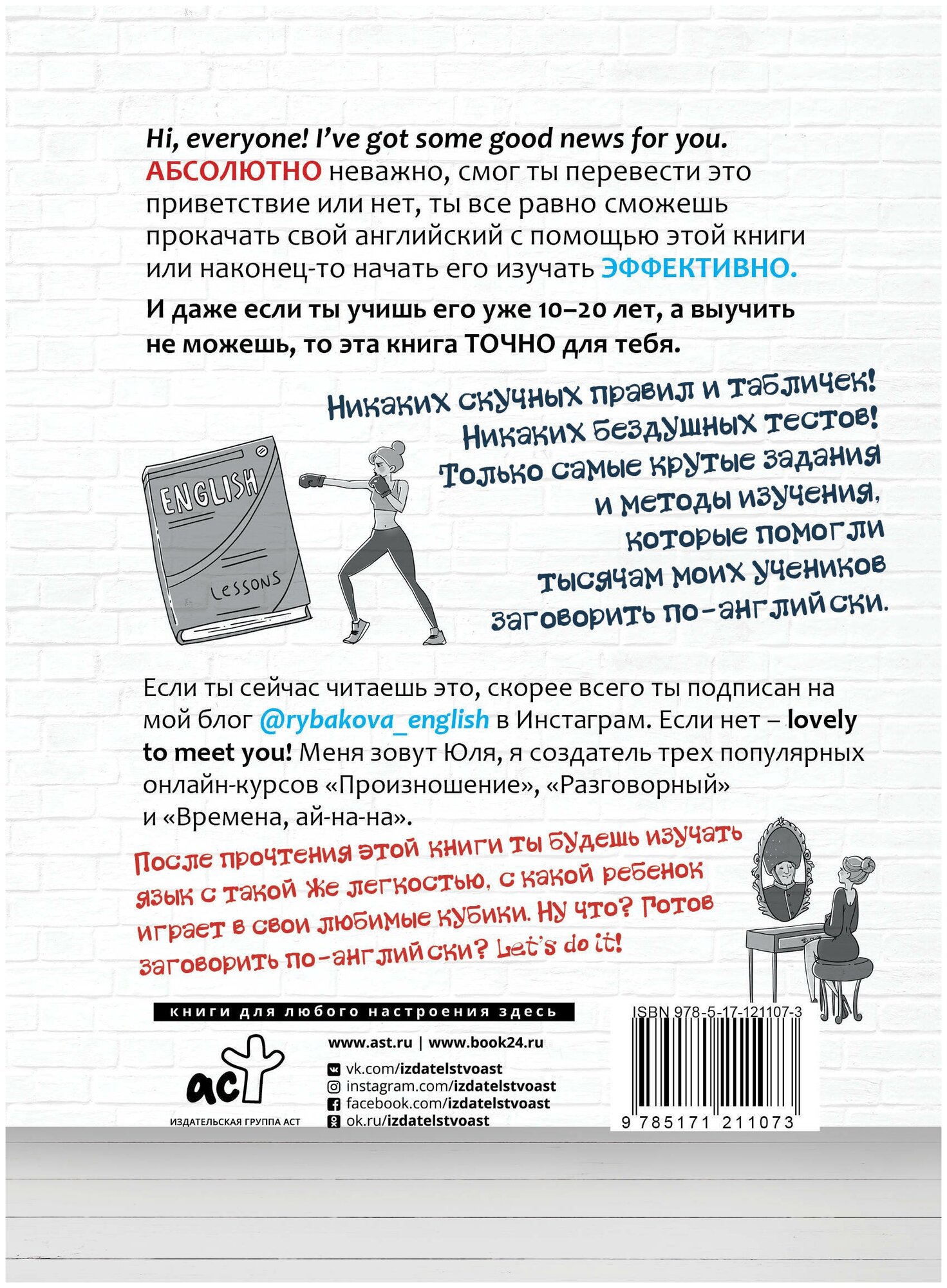 Автор, Юлия Рыбакова, не только открыла популярные онлайн курсы "Произношение", "Разговорный" и "Времена, ай-на-на", она создала свой блог @rybakova_english в Инстаграме, и уже более 160 тысяч подписчиков успешно занимаются английским по ее методике.