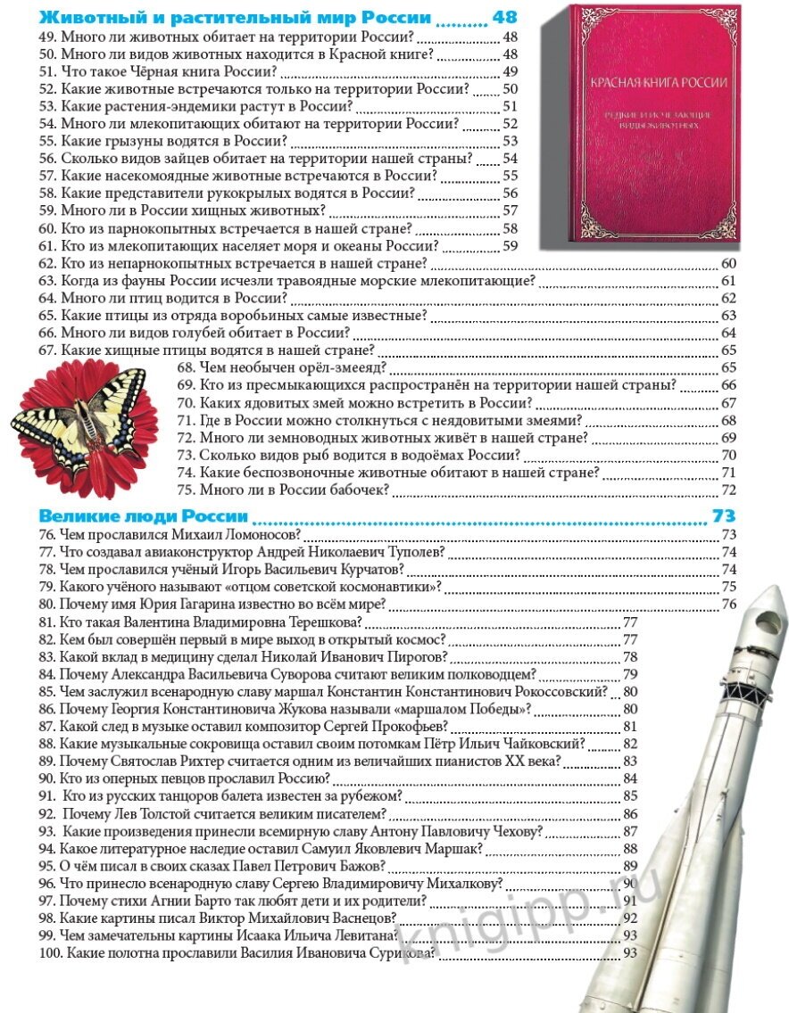 Эта книга из серии "100 вопросов и ответов" расскажет ребятам о том, как была образована наша страна Россия, ее географии, животном и растительном мире. Также в книге есть информация о известных российских людях, которые внесли свой вклад в науку, искусство отечества и многое другое - все то, что должен знать ребенок о своей стране.