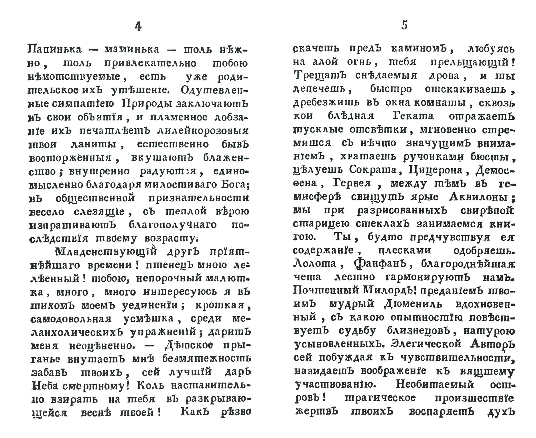 Репринт с издания. Москва, 1802. Очень смешные сегодня перлы допушкинской эпохи. «Сочинение сие и со стороны мыслей, и со стороны слога может рекомендовано быть чтению особ, любящих заниматься книгами, кои нечувствительно заставляют читающего входить в себя, обдумывать сказанное в оных и тем самым питать дух и сердце. В ней помещены мелкие отрывки, числом 36, кои Автор начертал о разных предметах, размышлению его попадавшихся, и кои приносят честь образу суждения его и отличаются тонкостию мыслей и трогательностию изъяснения. Вот некоторые из оных: “К отчизне” – “Удовольственное времяпровождение” – “Ничтожность подлунного” – “Жребий человечества” – “Чувство приятного” – “Весенняя прогулка” – “Вид осени” – “Мавзолей сердца” – “Истекшему 1801 г.” – “Гимн создавшему” и проч. и проч.» Тираж 30 экз. выполнен по технологии print-on-demand.
