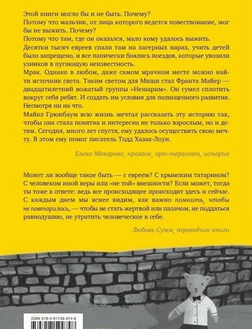 Уверена, дети поймут и проникнутся этой историей. Будут вместе с Мишей верить в лучшее и отвадят беду, чтобы не закинули в тот злополучный поезд, который уносит тысячи людей, чьи жизни вскоре оборвутся в газовых камерах Аушвица.