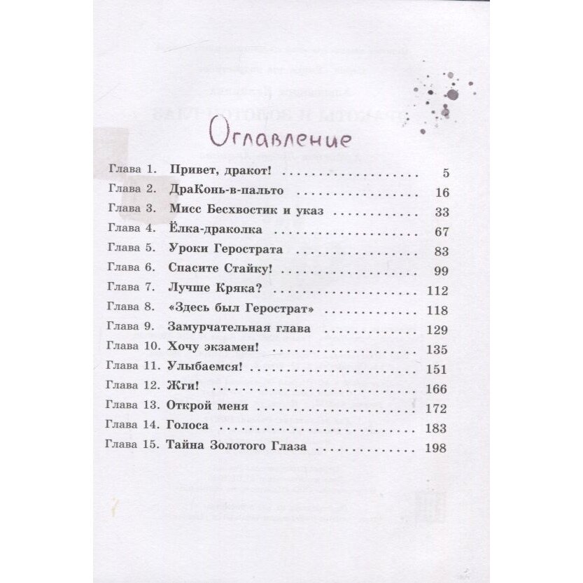 Далеко-далеко стоит замок, полный чудес. В нём учат главному: Прямолетанию, Драконологии, жалостливому взгляду. Люди никогда не увидят ни директора школы, ДраКоня-в-пальто, ни дракотов, ни гениального дракона Герострата. Впрочем, если ты всеми отверженный подросток, эти ребята возьмут тебя в свою команду. Но для чего? Как понять, кто тебе друг, узнать все секреты, спасти сестру и разгадать тайну Золотого Глаза?
