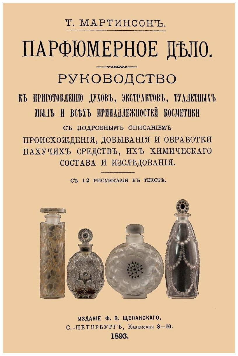 Репринт с издания. СПб., 1893. С 12 рис. в тексте. Это уникальный сборник старинных рецептов косметических средств. Автор, по профессии химик-технолог, приводит очерк истории парфюмерного дела, рассказывает о способах изготовления разнообразных ароматических составов, туалетных мыл, зубных полосканий и порошков, воды для мытья волос и головы, румян, пудр, одеколонов и средств по уходу за кожей. В издании приводятся описания ингредиентов парфюмерного производства, их свойства и способы обработки. Многие способы приготовления косметических средств, описанные в этой книге, подходят для домашних условий, однако автор стремился к тому, чтобы заинтересовать молодых предпринимателей и побудит их расширить косметическое производство в Российской империи. Тираж 30 экз. выполнен по технологии print-on-demand.