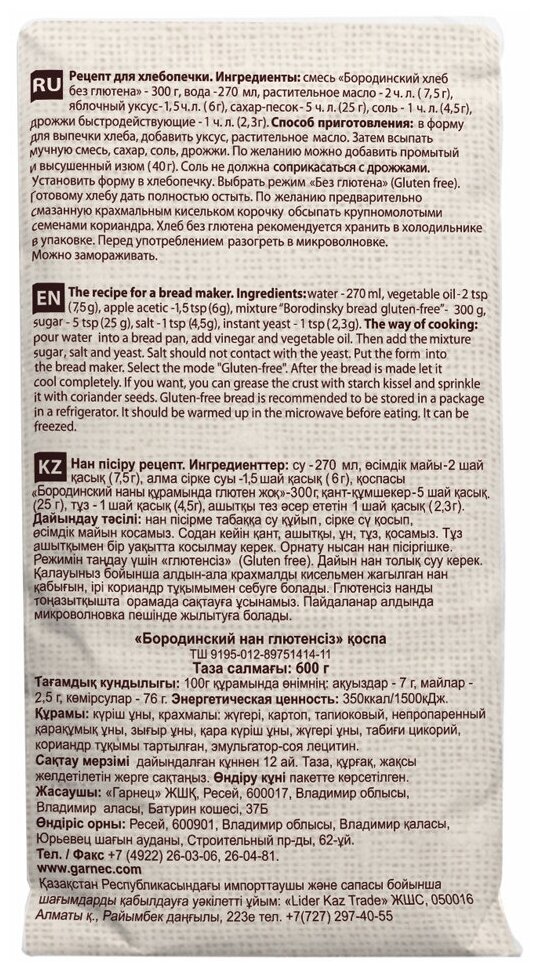 Смесь для выпечки Garnec Бородинский хлеб без глютена 600г позволит вам испечь свежий домашний хлеб, который будет не только вкусным, но и очень полезным для здоровья. В основе рецептуры – кукурузный крахмал и несколько видов муки цельного помола. В состав также входит молотый кориандр, придающий готовому хлебу поистине восхитительный аромат и легкую пикантность. Рецепт приготовления вы найдете на упаковке. Безглютеновая продукция торговой марки «Гарнец» производится из высококачественного сырья в отдельном помещении на специальном оборудовании. Она не содержит ГМО, красителей, консервантов, ароматизаторов и прочих искусственных добавок, поэтому идеально впишется в рацион аллергиков и людей, страдающих целиакией. Смесь проходит тщательную проверку на отсутствие глютена как на предприятии, так и в сторонних лабораториях.
