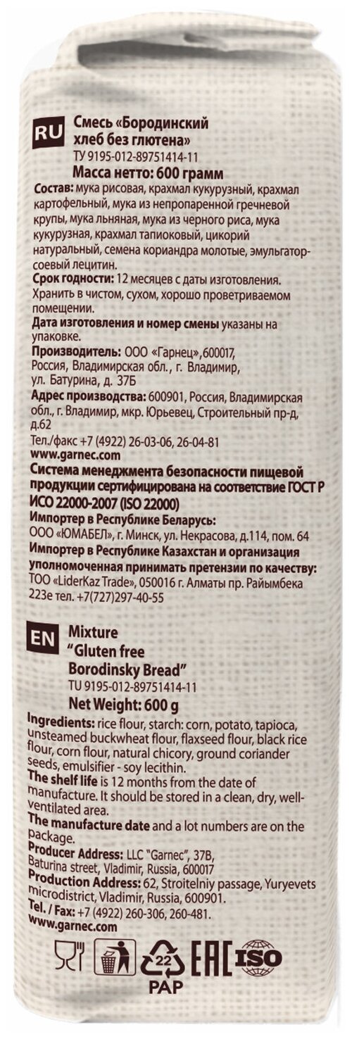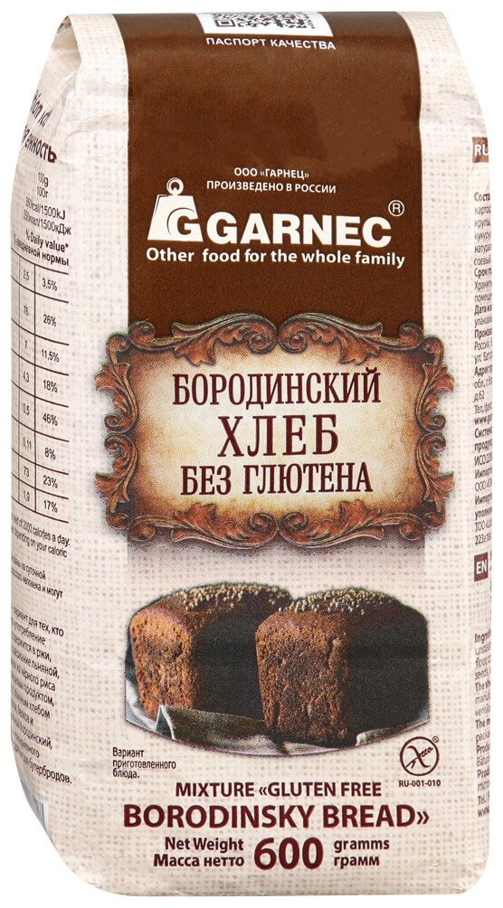 Смесь для выпечки Гарнец Бородинский хлеб без глютена 600г Garnec