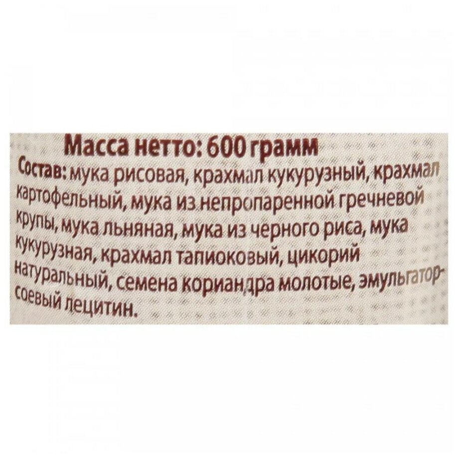 | Состав | мука рисовая, крахмал кукурузный, крахмал картофельный, мука гречневая из непропаренной гречневой крупы, мука льняная, мука из чёрного риса, мука кукурузная, крахмал тапиоковый, цикорий натуральный, семена кориандра молотого, эмульгатор лицитин |