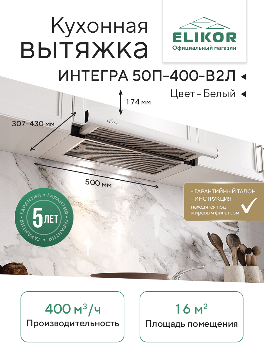 Сервис сравнения цен СкидкаГИД предлагает сравнить цены на товар «Вытяжка встраиваемая Elikor Интегра 50П-400-В2Л белый»