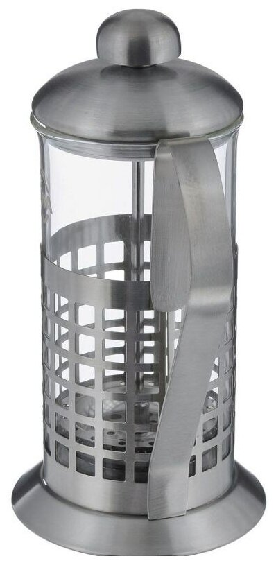 Тип: френч-пресс Материалы: нержавеющая сталь, боросиликатное стекло Объём: 0.8 л Френч - пресс - это устройство изначально использовавшееся для приготовления кофе, путем заваривания и отжима, включает в себя стеклянную емкость и поршень с фильтром. Для френч - пресса используют специально крупнопомолотый кофе. На данный момент френч - пресс широко применяется и для заваривания чая, настаивания трав и ягод. Использование. Чай или кофе засыпают в френч - пресс, заливают горячей водой необходимой температуры и настаивают 3 - 4 минуты. Затем нажимают на поршень, который отделяет напиток от чаинок или кофейной гущи, и вся гуща оказывается на дне, прижатая прессом, а отфильтрованный настой над ним. Это прекрасная альтернатива заварочному чайнику, пресс легко моется и не занимает много места на кухне.