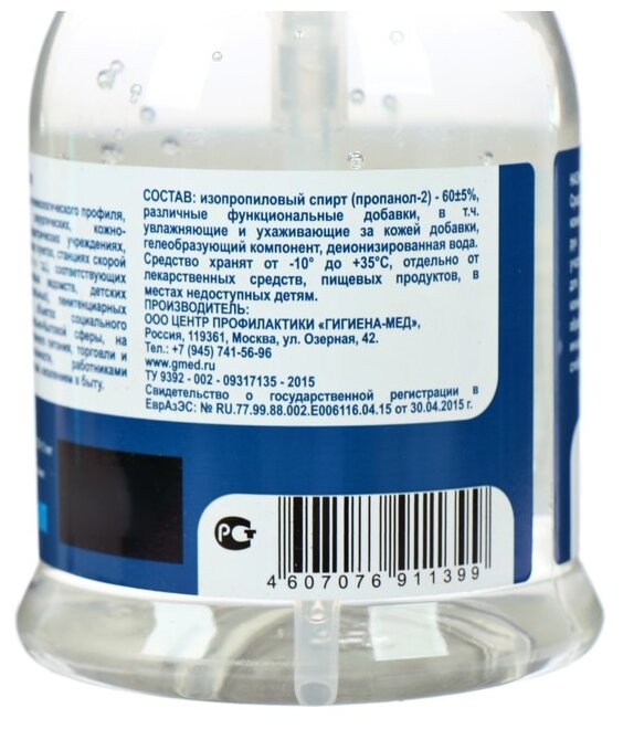 | Состав | изопропиловый спирт (2- пропанол) – 60,0 ± 5,0%, а также функциональные и технологические компоненты, в том числе увлажняющие, восстанавливающие и ухаживающие за кожей добавки, в том числе D-пантенол, гелеобразующий компонент. |