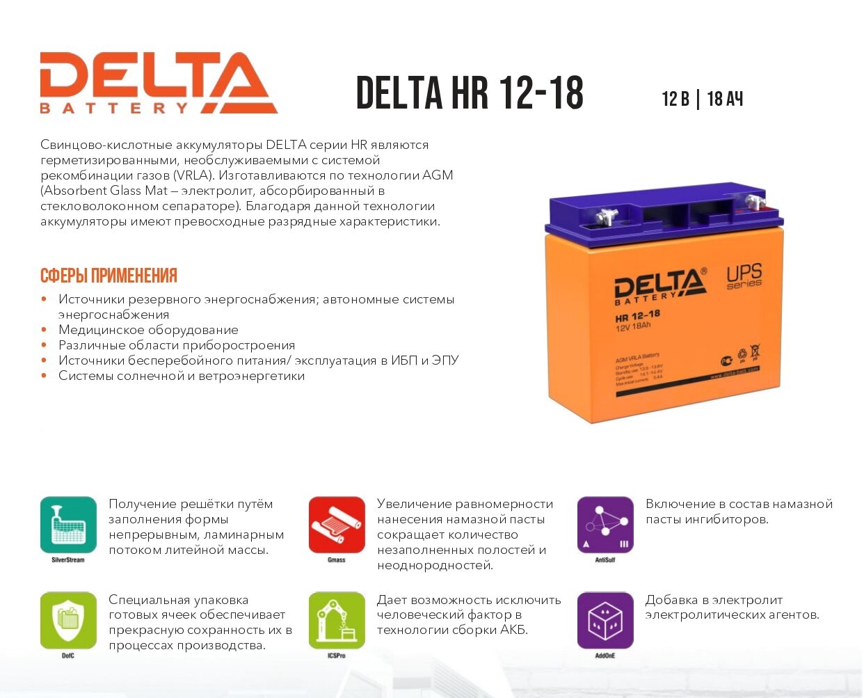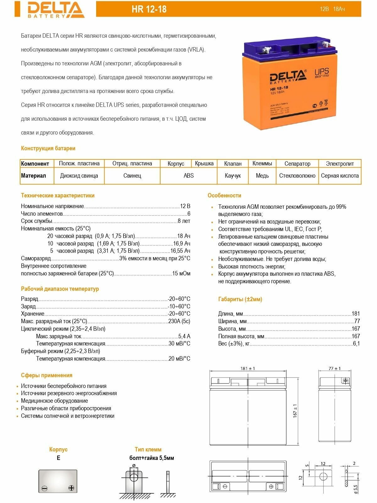 Герметизированный VRLA cвинцово-кислотный аккумулятор Delta HR 12-18 напряжением 12В и емкостью 18Ач изготовлен по технологии AGM (с микропористым заполнителем, пропитанным электролитом). Корпус изготовлен из негорючего ABS пластика. Срок службы аккумулятора достигает 8 лет. Аккумулятор относится к линейке DELTA UPS series и предназначен для работы в системах бесперебойного питания (ИБП). Обладает низким внутренним сопротивлением и высокой плотностью энергии. Дополнительно к аккумулятору у нас можно подобрать зарядное устройство для него, батарейный шкаф или стеллаж.