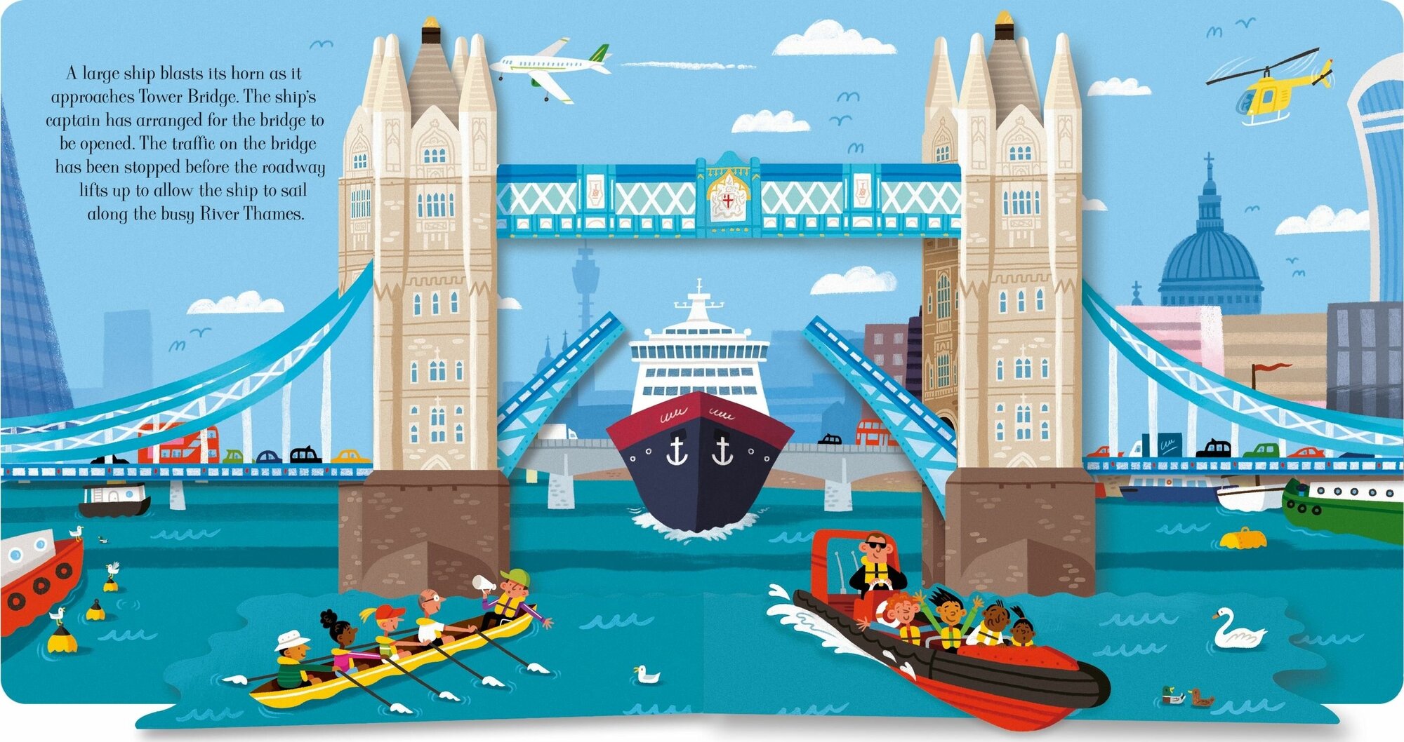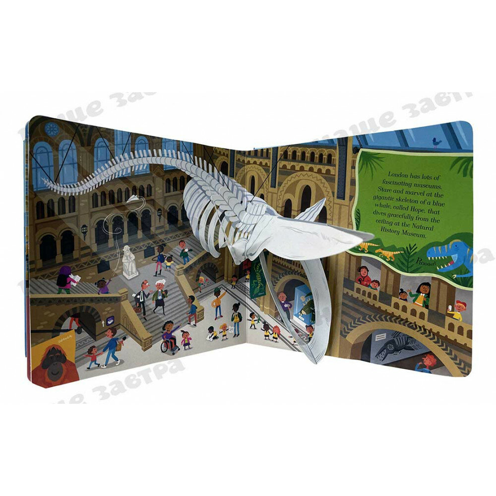 Explore the city of London in this delightful pop-up book with detailed 3-D scenes designed by Jenny Hilborne. Discover the skyline with the London Eye, the Shard, Big Ben and Nelson's Column, a gigantic skeleton in the Natural History Museum, a military band outside Buckingham Palace, Tower Bridge opening, and lots more famous London sights.