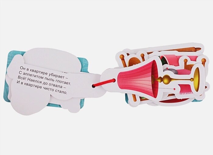 Книжечка карманного формата состоит из твердых страничек-карточек на шнурочке. С одной стороны карточки — стишок, с другой — симпатичная картинка к нему (в каждой книжке 10 картинок и соответственно 10 стишков — про диван, пылесос, настольную лампу, кровать и т.д.).