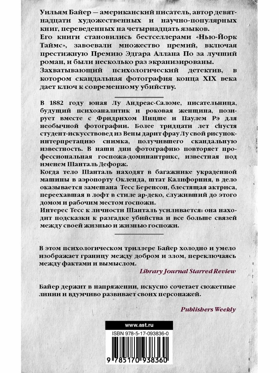 В 1882 году юная Лу Андреас-Саломе, писательница, будущий психоаналитик и роковая женщина, позирует вместе с Фридрихом Ницше и Паулем Рэ для необычной фотографии. Более тридцати лет спустя студент-искусствовед из Вены дарит фрау Лу свой рисунок-интерпретацию снимка, получившего скандальную известность. В наши дни фотографию повторяет профессиональная госпожа-доминантрикс, известная под именем Шанталь Дефорж.