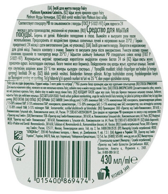 Средство для мытья посуды 650 мл FAIRY (Фейри) Platinum "Ледяная свежесть" 1009471