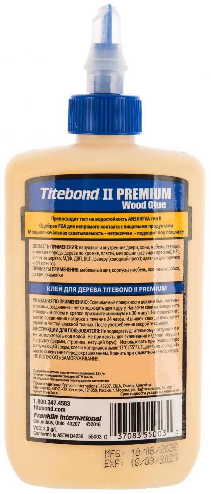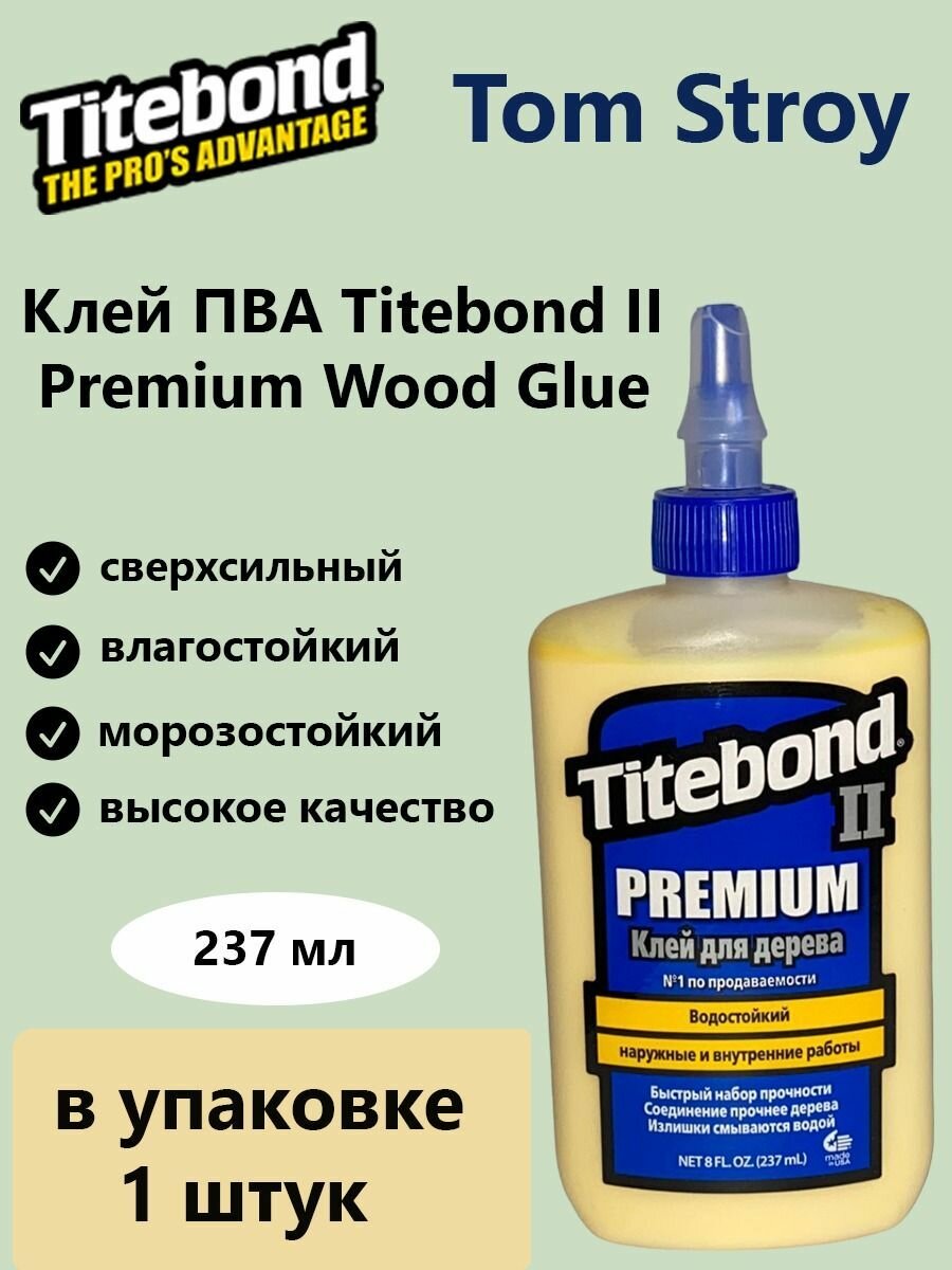 TITEBOND II Premium - самый популярный клей в линейке клеев ПВА. Однокомпонентный клей, который удовлетворяет требованиям стандарта по водостойкости ANSI Тип II. Он идеален для наружного применения, включая садовую и уличную мебель, скворечники, почтовые ящики, столы для пикника и т.д.
