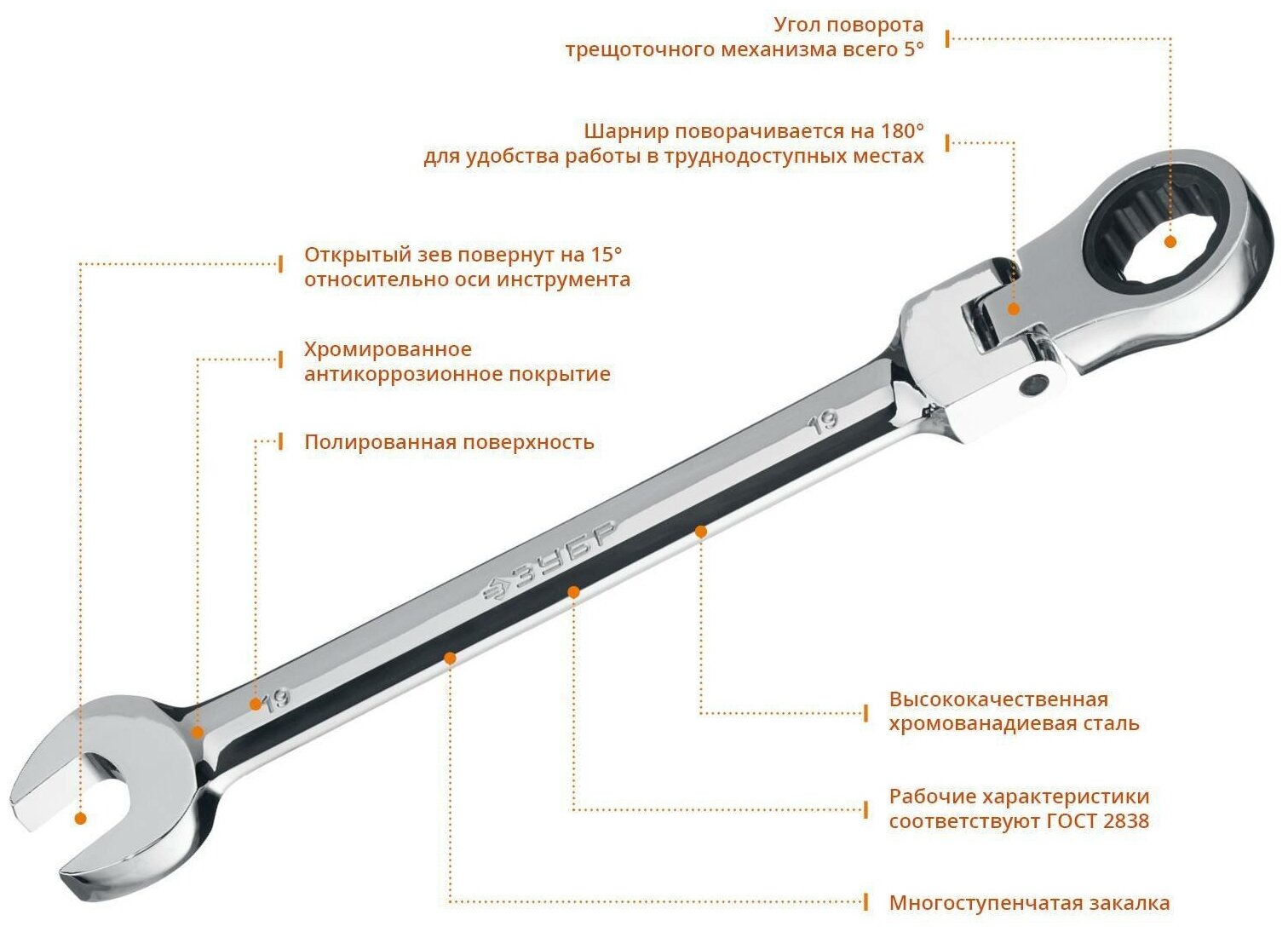 ЗУБР 19 мм, шарнирный трещоточный гаечный ключ, Профессионал ()