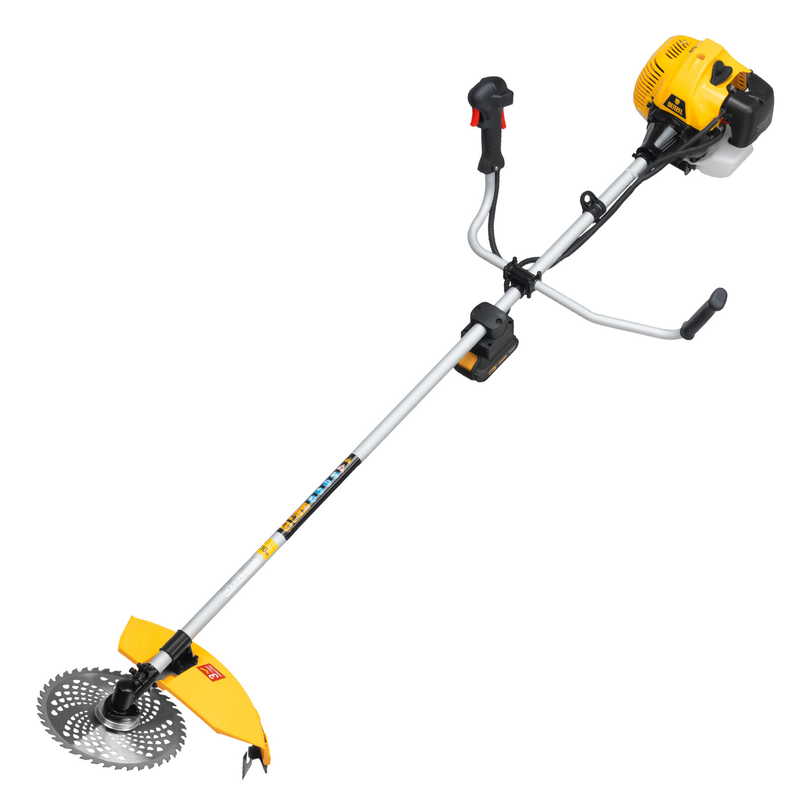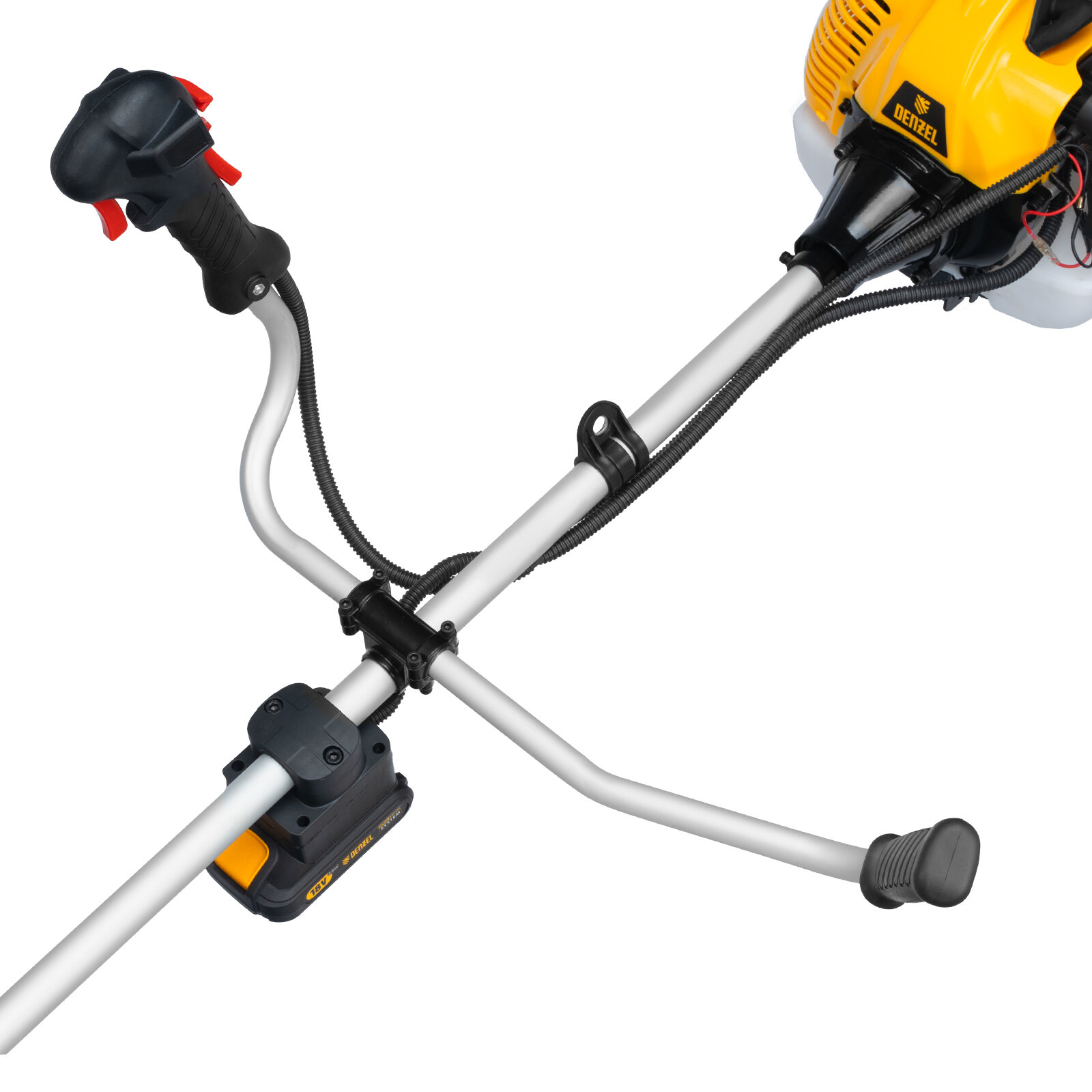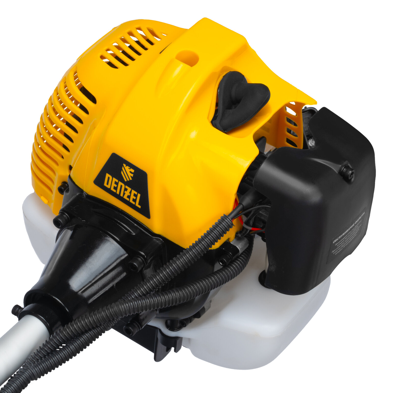 Бензиновый триммер Denzel DT-52E 962025 с двигателем объемом 52 куб. см, с неразъемной штангой и электростартером, поставляется комплектом из 2 частей и используется для ухода за дачным участком. С его помощью можно подравнять газон, скосить траву любого типа, в том числе с жесткими древовидными стеблями (полынь, крапива, лебеда, борщевик), а также срезать кустарник и молодые побеги деревьев с диаметром стволов до 10 мм. Триммер успешно справляется с этими задачами благодаря входящим в комплект катушке с леской и пильному диску с шириной скашивания 42 и 25,5 см соответственно. На штангу уже установлен редуктор и корпус сцепления, что упрощает подготовку инструмента к работе.ПреимуществаВысокий ресурс — благодаря хромированному цилиндру двигателя, прочному сцеплению и надежному редуктору триммер выдерживает работу при повышенных нагрузках.Безопасность — блокиратор курка газа препятствует случайному запуску двигателя, прочный пластиковый кожух защищает пользователя от летящей травы, грязи и прочих твердых частиц.Легкий запуск в любых условиях — благодаря электростартеру двигатель запускается одним нажатием на кнопку, а праймер для подкачки топлива облегчает запуск после длительного перерыва.Круиз-контроль — двигатель поддерживает заданные обороты, что позволяет не отвлекаться на регулировку скорости во время длительной работы.Полуавтоматическая система подачи лески — удлинить ее можно прямо во время работы — достаточно слегка ударить катушкой о землю.Автоматическая подрезка лески — нож на кожухе укорачивает концы корда до нужной длины, что предотвращает перегрузку двигателя.Легкое управление — все функциональные клавиши вынесены на правую рукоятку.Максимально комфортная работа — благодаря плечевому ремню триммер удобно удерживать, а мягкая пластина предохраняет пользователя от вибраций и ударов штангой по бедру.Полный комплект поставки — аккумулятор, зарядное устройство и удобный дозатор для приготовления топливной смеси прилагаются к триммеру.Дополнительные возможности — можно приобрести и установить на триммер диски Denzel 96323, 96325 для быстрого удаления растительности с жесткими стеблями (полыни, крапивы, лебеды), 96328 для скашивания молодых побегов кустарника диаметром до 3 мм.Гарантия 3 года — высокое качество техники подтверждено производителем.