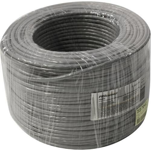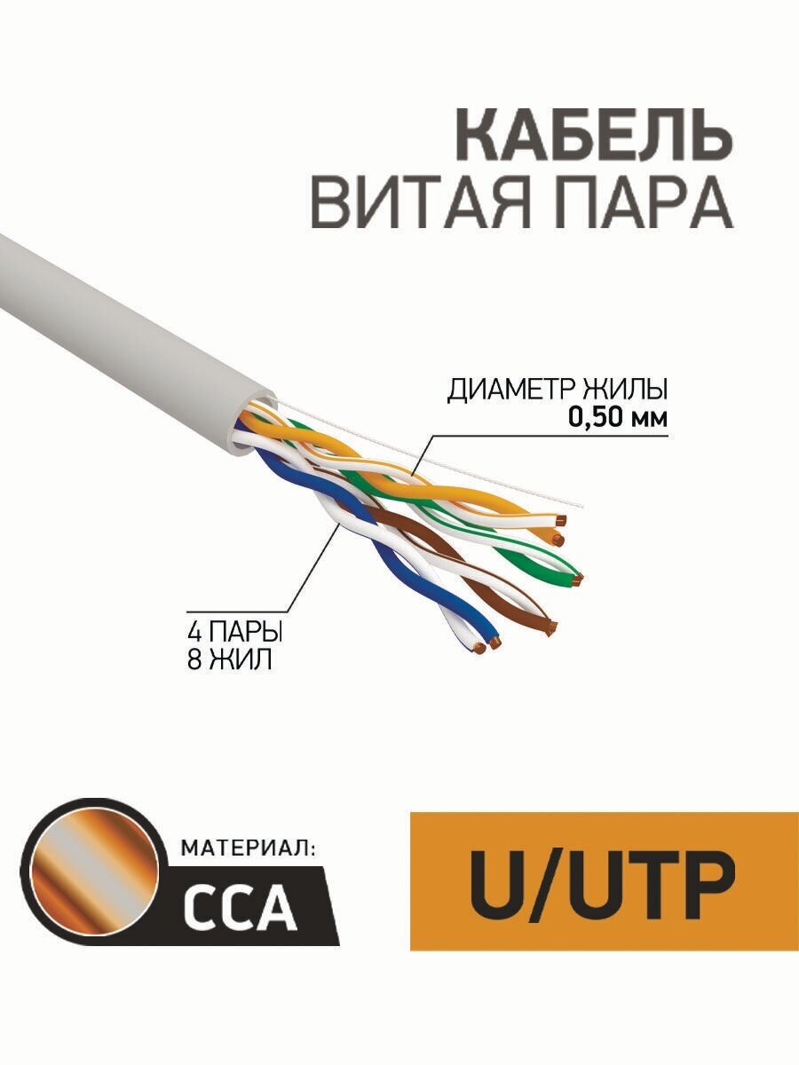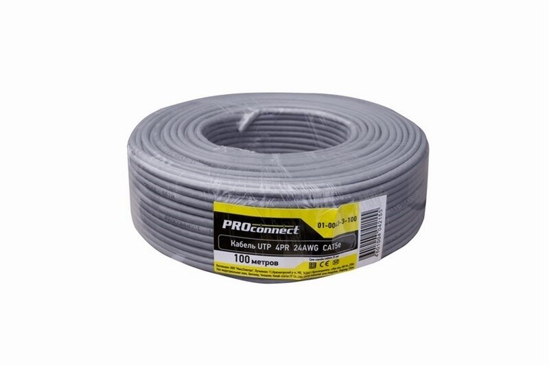 Кабель UTP 4PR 24AWG CAT5e CCA PROCONNECT. Неэкранированная витая пара, материал проводника алюминий плакированный медью CCA диаметром 0,5 мм. (24 AWG). Материал оболочки - ПВХ (PVC). ОБЛАСТЬ ПРИМЕНЕНИЯ КАБЕЛЯ: - Локальные сети общего назначения. - Домашние сети. - Сети малого бизнеса. - Компьютерные сети. - Сети передачи данных. - Телефония. - Цифровое телевидение. - Системы видеонаблюдения (IP-камеры). - Системы охраны и контроля доступа. - Узкоспециализированные сети (торговое оборудование, складские сети, производственные сети с использованием нестандартного периферийного оборудования, такого как, станки, вариаторы, типографские машины). Кабель витая пара соединяет и передает сигнал между компьютерами, компьютерами и сервером.