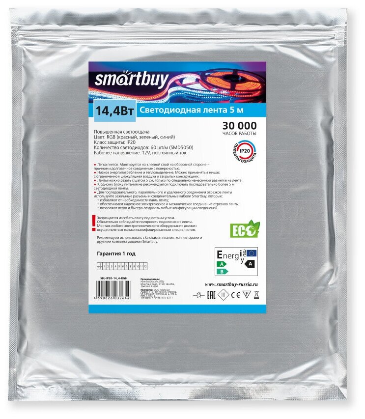 Светодиодная LED лента SmartBuy сконструирована на базе светодиодов Epistar в корпусе 5050. Лента выпускается на гибкой печатной плате белого цвета шириной 8 мм и поставляется в катушках по 5 м. Каждая катушка с лентой SmartBuy укомплектована проводами для подключения к источнику питания. Эффективность светодиодной ленты более 70 лм/ Вт. Срок службы светодиодной ленты Smartbuy составляет 30 000 часов.Лента легко гнется, монтируется в клеевой слой на оборотной стороне - прочное и долговечное соединение с поверхностью.Низкое энергопотребление и тепловыделение. Можно применять в нишах с ограниченной циркуляцией воздуха и закрытых конструкциях.