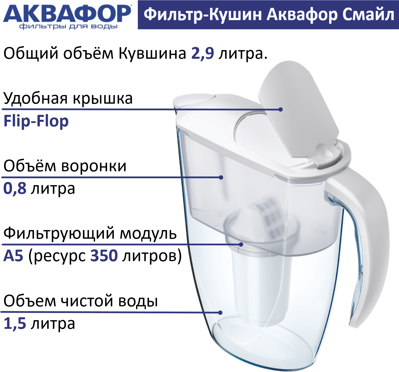 | Фильтры/картириджы в комплекте | Аквафор Смайл комплектуется сменным модулем A5. |