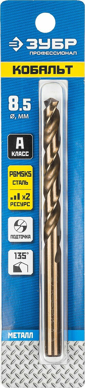 Сверло по металлу Зубр Кобальт 29626-8.5 8.5х117мм, HSS-R, быстрорежущая сталь М2(S6-5-2) Р6М5, класс А