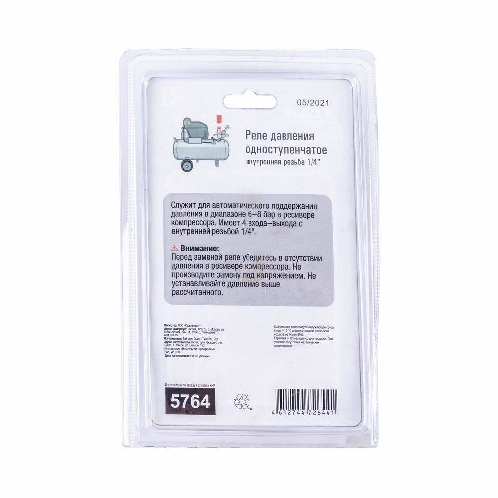 | Примечание | Реле давления одноступенчатое (1/4") Foxweld AERO 5764 служит для автоматического поддержания давления в ресивере компрессора в диапазоне 6-8 бар. Реле имеет 4 входа-выхода с внутренней резьбой 1/4?. Реле давления предназначено для контроля перепадов давления в пневмосистеме компрессора. Их главным элементом является пружина, которая изменяет свою жесткость в зависимости от значения этого параметра. Реле давления или прессостаты защищают компрессор от преждевременного износа отключая его электродвигатель при достижении максимального давления воздуха в системе и повторно включая его при падении давления ниже заданного значения. |