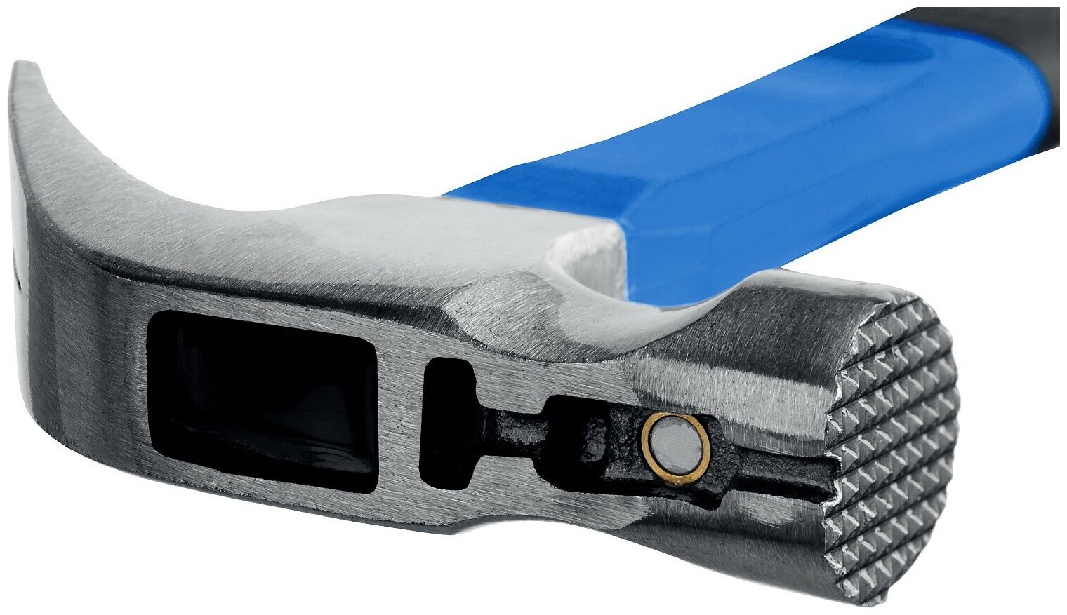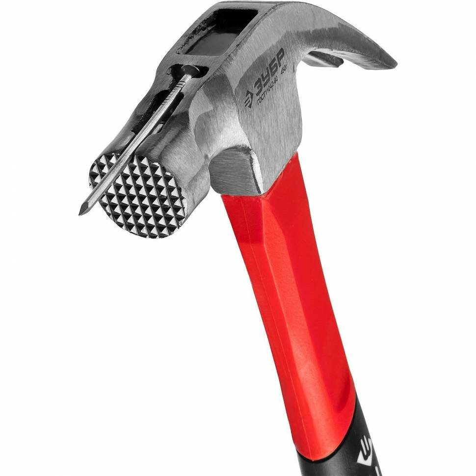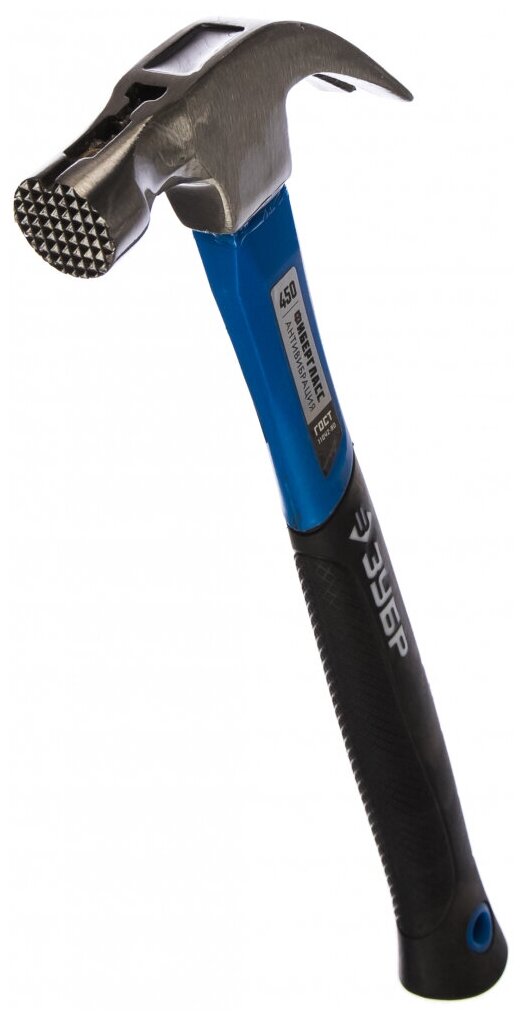 Столярный молоток-гвоздодёр ЗУБР с фиберглассовой рукояткой, кованный, с магнитом, 450 г, Профессионал (20356-450_z01)Модель - 20356-450_z01Технические характеристики:-Масса головы: 450 г-Материал головы: сталь 45 -Закалка головы: Индукционная -Материал рукоятки: Двухкомпонентная фиберглассовая -Конструкция крепления головы к рукоятке: Сверхпрочное -наличие магнита: да -Отверстие для подвеса инструмента: даМолоток ЗУБР профессионал оснащен особопрочной фибергласовой рукояткой. АВТ - технология позволяет существенно снизить вибрации, возникающие во время удара, что делает работу с инструментом более комфортной. Соответствует требованиям ГОСТ 11042-90.Преимущества:-Особопрочное крепление головы;-Антивибрационная технолгия (АВТ);-Кованая голова;-Рельефное противоскользящее покрытие рукоятки;-Фиберглассовая рукоятка;-Наличие магнита;