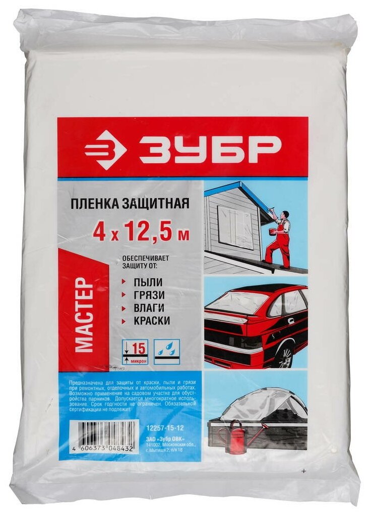 Пленка защитная укрывочная Зубр "Мастер" 12257-15-12, ПЭНД, 15 мкм, 4 х 12,5 м