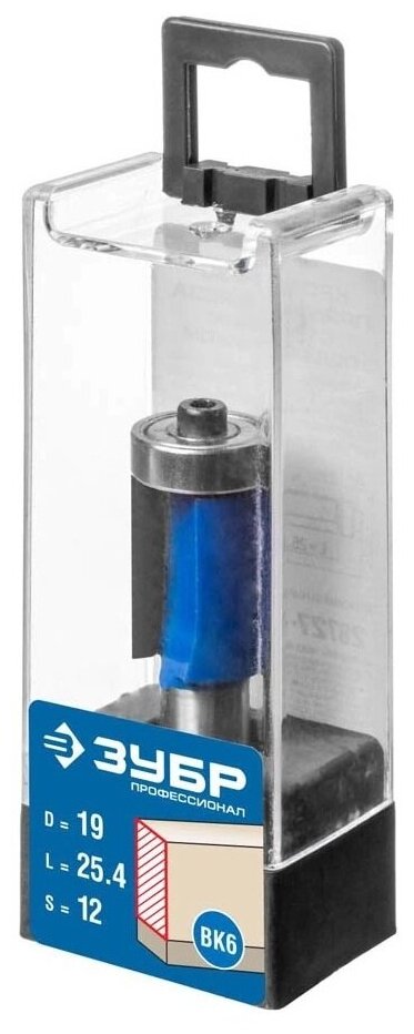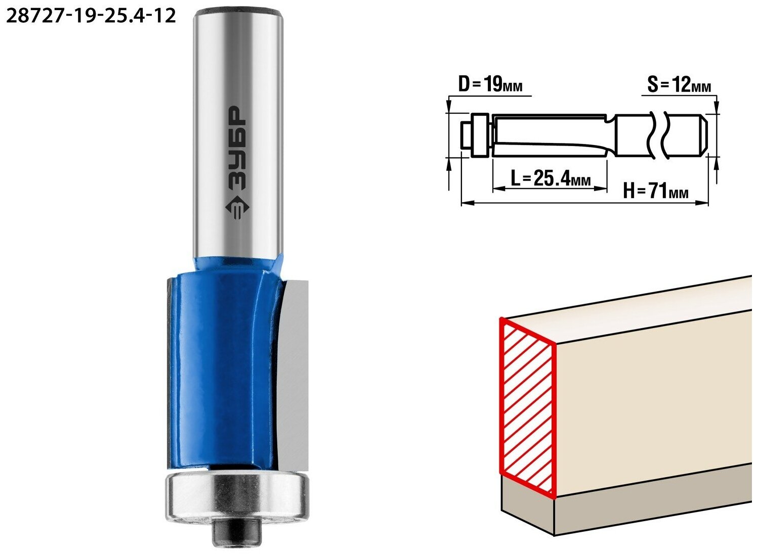 Фреза кромочная с нижним подшипником, D= 19мм, рабочая длина-25,4мм, хв.-12мм, d-19мм, ЗУБР Профессионал