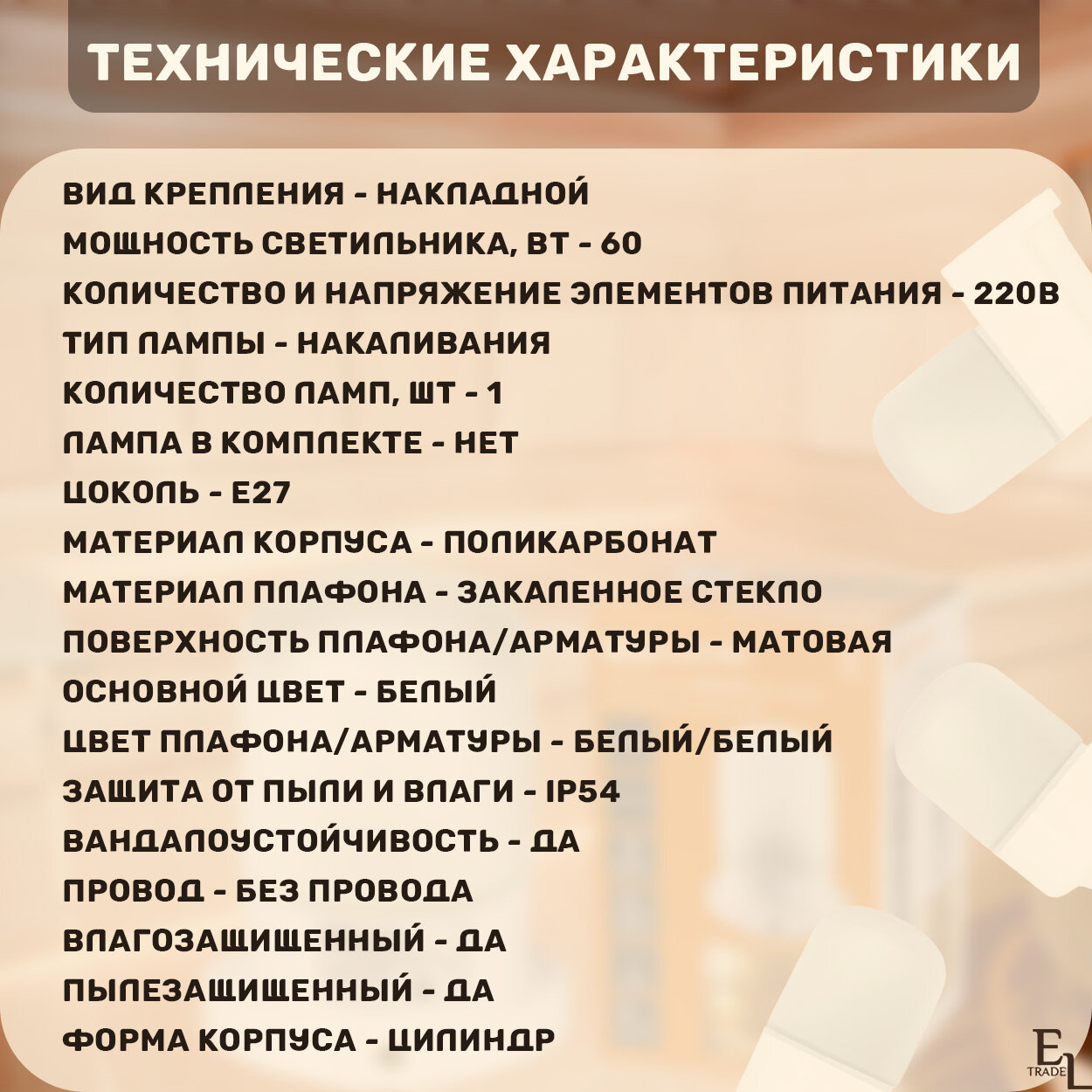 | Максимальная мощность лампочки | 60 Вт |