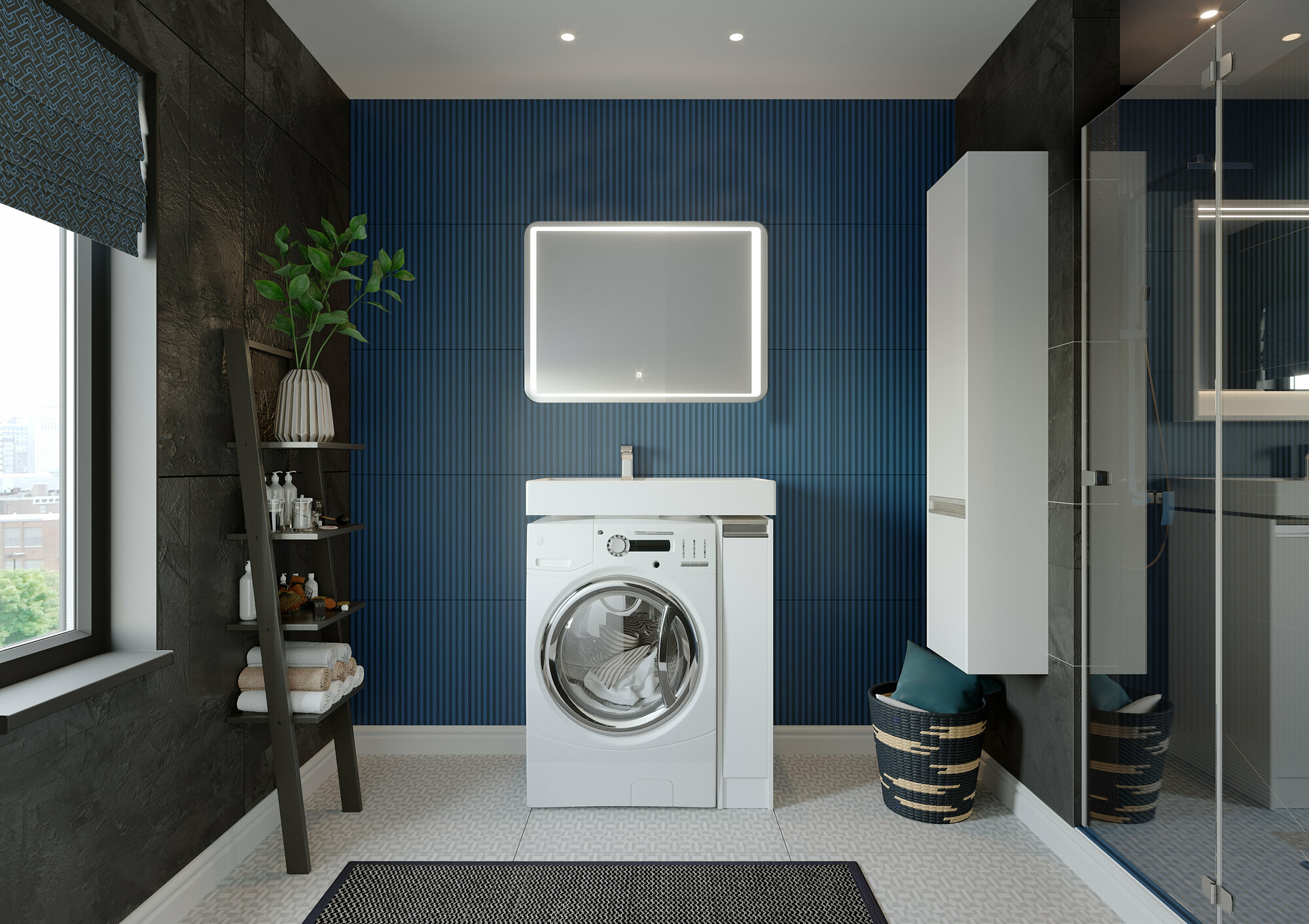 Тумба Лондри под стиральную машину выполнена из влагостойкой ламинированной плиты и окрашена в белоснежный цвет с высокой степенью глянца полиэфирной краской ультрафиолетового отверждения. Данный способ окрашивания обеспечивает изделию привлекательный внешний вид, а также износостойкость и долговечность. Ящик открывается с помощью изящной профильной хромированной ручки и состоит из двух отделений: верхнего и нижнего. Каждое отделение ящика выдерживает нагрузку до 20 кг. Над ручкой установлена вставка из влагостойкой ламинированной плиты благородного цвета дуб наварра. Тумба комплектуется раковиной Рейн 80 из прочного литого мрамора. Компактный размер данного комплекта подойдет для небольших ванных комнат и обеспечит место для хранения необходимых предметов и аксессуаров. Дополнительно