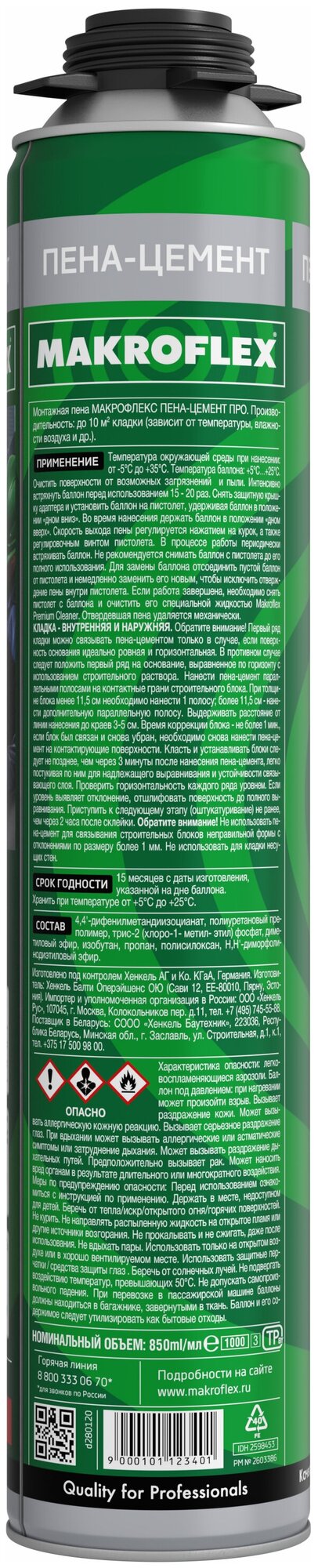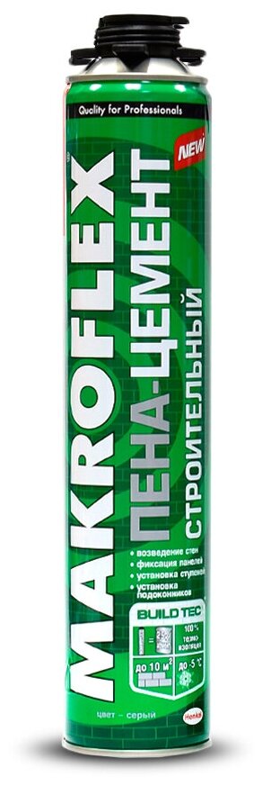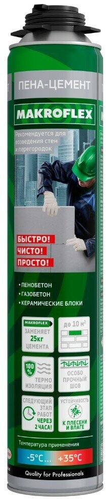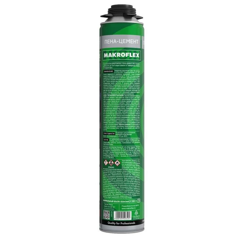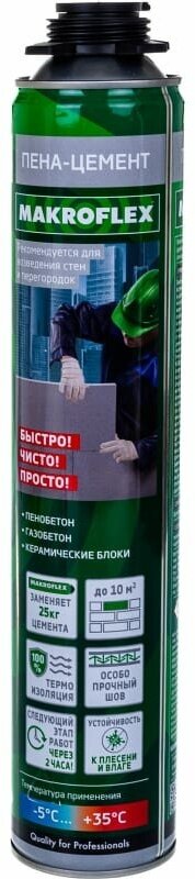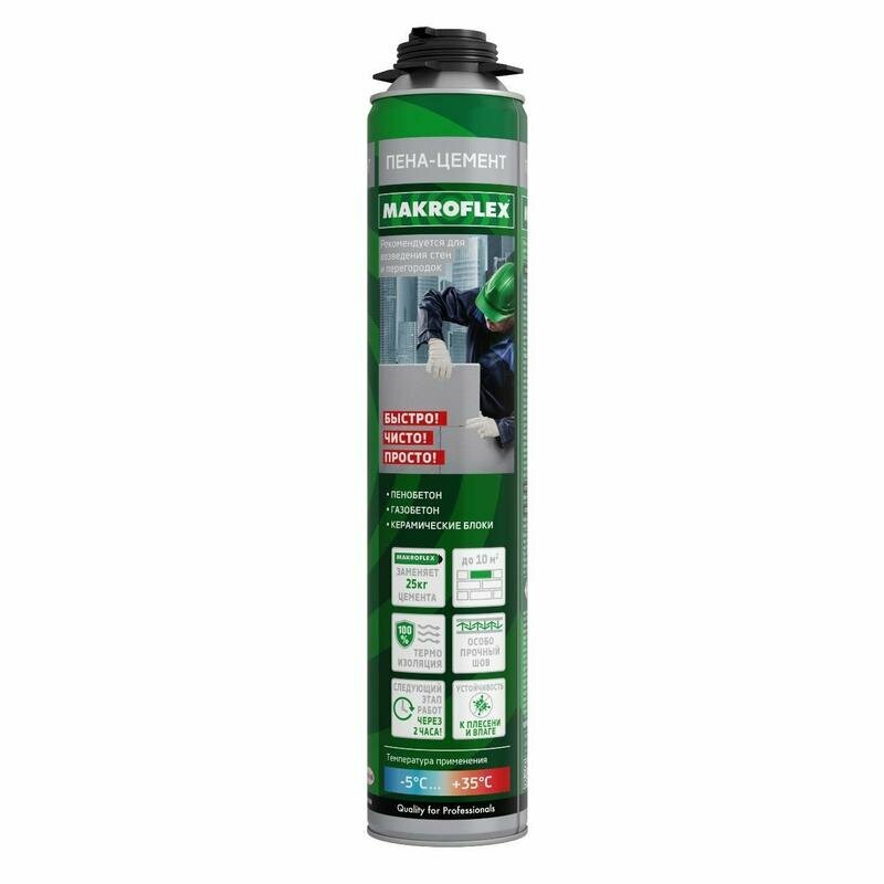 MAKROFLEX пена-цемент строительный Однокомпонентная аэрозольная полиуретановаяпена-цемент для соединения и крепления строительных материалов Характеристики может заменять цемент и подобные смеси; готова к применению, удобна в пользовании; эффективно соединяет строительные материалы; отлично подходит для крепления стенных панелей и других предметов к вертикальным поверхностям; подходит для внешних и внутренних работ; эффективно склеивает, герметизирует, обеспечивает тепло-шумоизоляцию; может применяться при отрицательных температурах. Благодаря этому инновационному продукту больше не понадобятся тяжелые мешки, дополнительное оборудование, вода и энергия; больше не будет пыли и грязи, длительной работы по очистке и других поглощающих время работ. Продукт позволяет выполнить работу значительно меньшими усилиями и помогает вдвое сократить затрачиваемое на работу время. МакрофлексПена-цемент Строительный устраняет температурные мостики и обеспечивает высокую прочность соединений, соответствующую требованиям к строительному раствору (EN 998–2). МакрофлексПена-цемент Строительный обладает превосходной адгезией к большинству строительных материалов, таких как древесина, бетон, камень, металлы и др. Продукт не содержит хлорфторуглеродных пропеллентов. СГР — MAKROFLEX Пена-цемент Проф Паспорт безопасности — MAKROFLEXПена-цемент Проф Лист технической информации — MAKROFLEX Пена-цемент Проф Области применения Связывание строительных блоков Фиксация изоляционных панелей к фасадам и фундаментам, панелей внутренней отделки к стенам. Заполнение небольших полостей Установка лестничных ступеней Установка подоконников Температура окружающей среды при примененииклей-пены — от −5°C до +35°C. Идеальная температура баллона при использовании: +23°С. Температура баллона может изменяться в допустимом интервале от +5°С до +30°С.