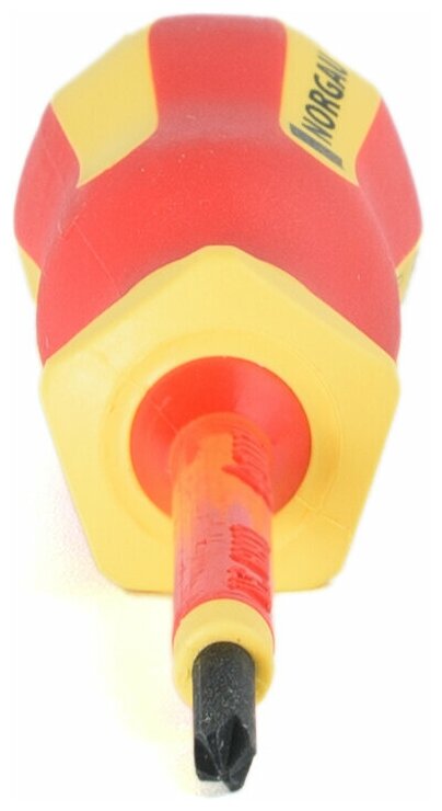 Диэлектрическая крестовая отвертка NORGAU VDE N171 — ручной слесарный инструмент, используемый для откручивания и закручивания резьбового крепежа: винтов, саморезов, шурупов, под напряжением до 1000 В. Изоляционный материал, покрывающий рукоятку и стержень изделия, обеспечивает мастеру безопасную работу. Жало защищено от коррозии фосфатным покрытием. Отвертка изготовлена из высококачественной стали SVCM, которая отличается особой прочностью, жесткостью и повышенной стойкостью к динамическим нагрузкам. За счет этого достигается долгий срок эксплуатации. Благодаря намагниченному наконечнику, процесс работы становится более комфортным — металлический крепеж не соскальзывает при закручивании. Двухкомпонентное покрытие рукоятки обеспечивает надежный захват инструмента и сводит к минимуму нагрузку на кисти. Площадка на рукояти предотвращает скатывание отвертки с поверхности. Общая длина инструмента 130 мм. Соответствует стандарту IEC 60900:2004.