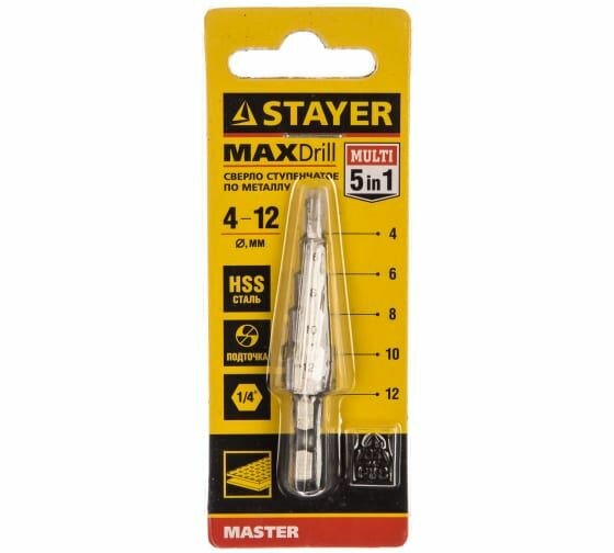 Сверло STAYER "MASTER" ступенчатое по сталям и цвет.мет., сталь HSS, d=4-12мм,5ступ.d 4-6-8-10-12,L-65мм, шестигран.хвост.1/4"