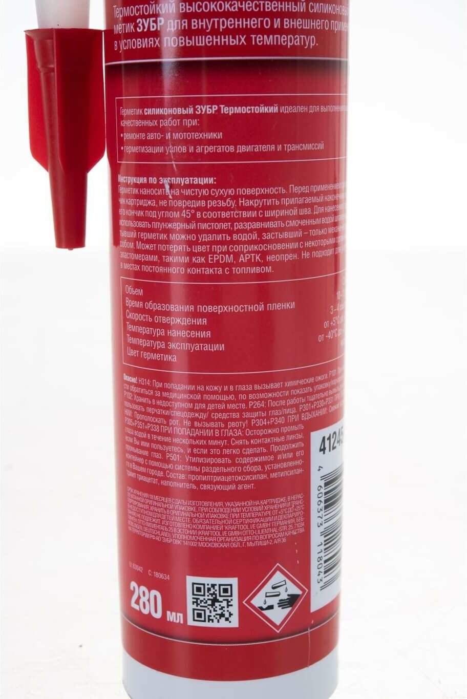 Герметик ЗУБР "мотор" силиконовый термостойкий, серия "Эксперт", красный, 280 мл ( ) Применяется для внутренних и наружных работ по герметизации, заполнению, уплотнению и ремонту различных материалов и конструкций. Высококачественные профессиональные герметики отличаются прекрасной адгезией к большинству материалов, устойчивостью к внешним факторам и долговечностью. • Выдерживает воздействие высоких температур (до 250°С, кратковременно до 275°С) • Устойчив к промышленным маслам и смазкам • Высокоэластичен • Водонепроницаемый • Устойчив к воздействию внешней среды, УФ-излучению • Долговечен • Применение: ремонт авто- и мототехники, герметизация узлов и агрегатов двигателя и трансмиссий • Произведен в Евросоюзе • Температура нанесения: +5.+40 °С • Температура эксплуатации: -40.+250 °С • Водостойкость: водонепроницаемый Профессиональный термостойкий силиконовый герметик широкого применения. -Тип: Силиконовый -Назначение: нейтральный -Объем: 280 мл-Цвет: Красный -Сопротивление растворителям: Маслостойкий -To эксплуатации: -40 до +250 °C руководство ПО эксплуатации 1. Герметик наносить на чистую, сухую поверхность. 2. Перед применением срезать кончик картриджа, не повредив резьбу, 3. Накрутить прилагаемый наконечник и срезать его кончик под углом 45 градусов в соответствии с шириной шва. 4. Для нанесения герметика использовать плунжерный пистолет. 5. Разравнивать герметик можно смоченным водой шпателем.6. Незастывший герметик можно удалить водой, застывший - только механическим способом. Рекомендуется для работ в местах, подверженных воздействию высоких температур. Может потерять цвет при соприкосновении с некоторыми органическими эластомерами, такими как EPDM, APTK и неопрен. Не пригоден для уплотнения в местах контакта с топливом.