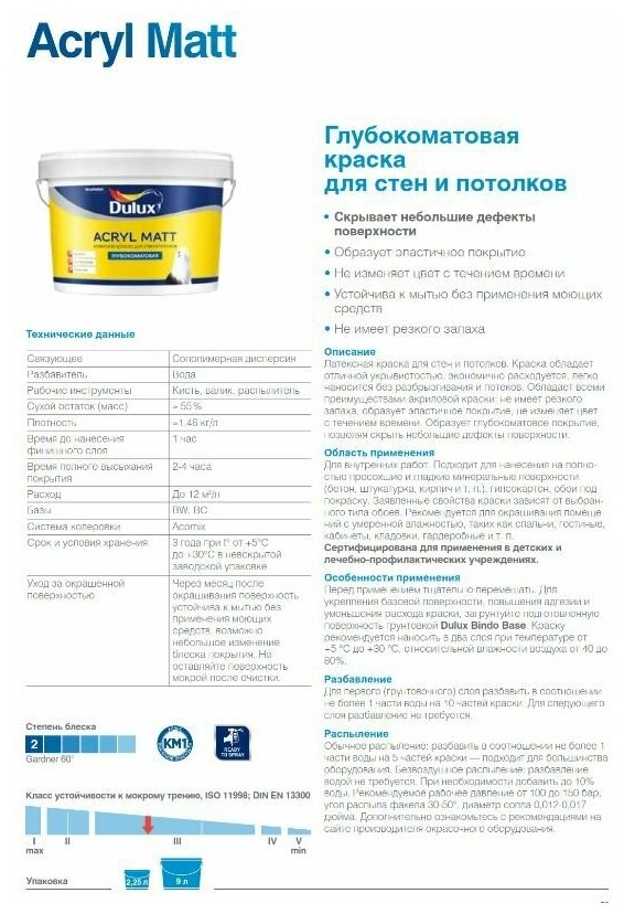 Латексная краска для стен и потолков Dulux Acryl Matt | Дюлакс Акрил Мат глубоко-матовая Глубоко-матовая латексная краска для стен и потолков. Обладает отличной укрывистостью, экономично расходуется, легко наносится без брызг и потеков. Обладает всеми преимуществами акриловой краски: не имеет резкого запаха, образует эластичное покрытие, не изменяет цвет с течением времени. Образует глубоко-матовое покрытие, позволяя скрыть небольшие дефекты поверхности. Экологичность подтверждена эко-сертификатом "Листок Жизни". Сертифицирована для применения в детских и лечебно-профилактических учреждений. Область применения Для внутренних работ. Подходит для нанесения на полностью просохшие минеральные поверхности (бетон, штукатурка, кирпич и т. п.), гипсокартон, обои под покраску. Рекомендуется для окраски помещений с умеренной влажностью, таких как спальня, гостиная, кабинет, кладовка, столовая, раздевалка и т. п. Количество слоев: 2 слоя. Подготовка поверхности Поверхность должна быть сухой и чистой. Перед окраской минеральной поверхности и гипсокартона очистите их от пыли, грязи, отслаивающихся частей старого покрытия. Дефекты зашпатлюйте. Ранее окрашенные и зашпатлеванные поверхности ошлифуйте. Для укрепления базовой поверхности, повышения адгезии и уменьшения расхода загрунтуйте подготовленную поверхность грунтовкой Dulux Bindo Base. При использовании другой грунтовки сделайте пробный выкрас на небольшом участке поверхности. Окрашивая обои, убедитесь, что на поверхности не осталось клея. Чтобы обои не отстали, наносите краску не ранее 24 часов после оклейки. Покраска Перед применением разбавить в рекомендованной пропорции и тщательно перемешать. Рекомендуется наносить в два слоя при температуре от +5 °C до +30 °C, относительной влажности воздуха от 40 до 80 %. Используйте кисть с синтетическим ворсом, валик для водно-дисперсионной краски или распылитель. После покраски: максимально очистите инструмент от краски, затем промойте водой. Хранение 3 года при t° от +5°С до +30°С в невскрытой заводской упаковке вдали от источников излучения, нагревательных и осветительных приборов. Утилизация Не сливайте краску в канализацию или водосток, обращайтесь в специализированные пункты утилизации. Уход за окрашенной поверхностью Избегайте мытья и интенсивной очистки свежеокрашенной поверхности. Покрытие достигает окончательной твердости в течение 30 дней. При необходимости очистки используйте мягкую сухую ткань. Через месяц после окрашивания поверхность можно мыть без применения моющих средств. Не оставляйте поверхность мокрой после очистки.