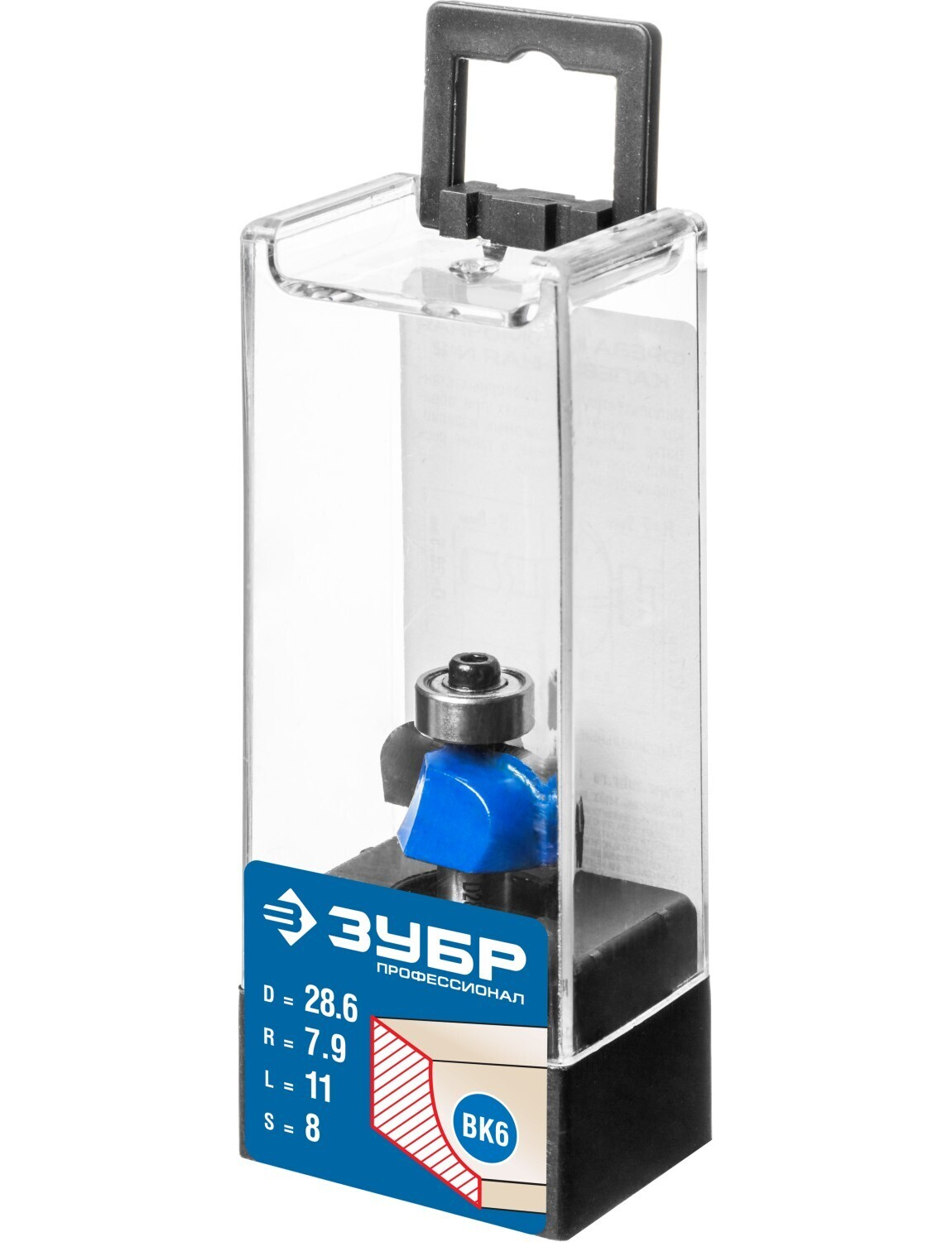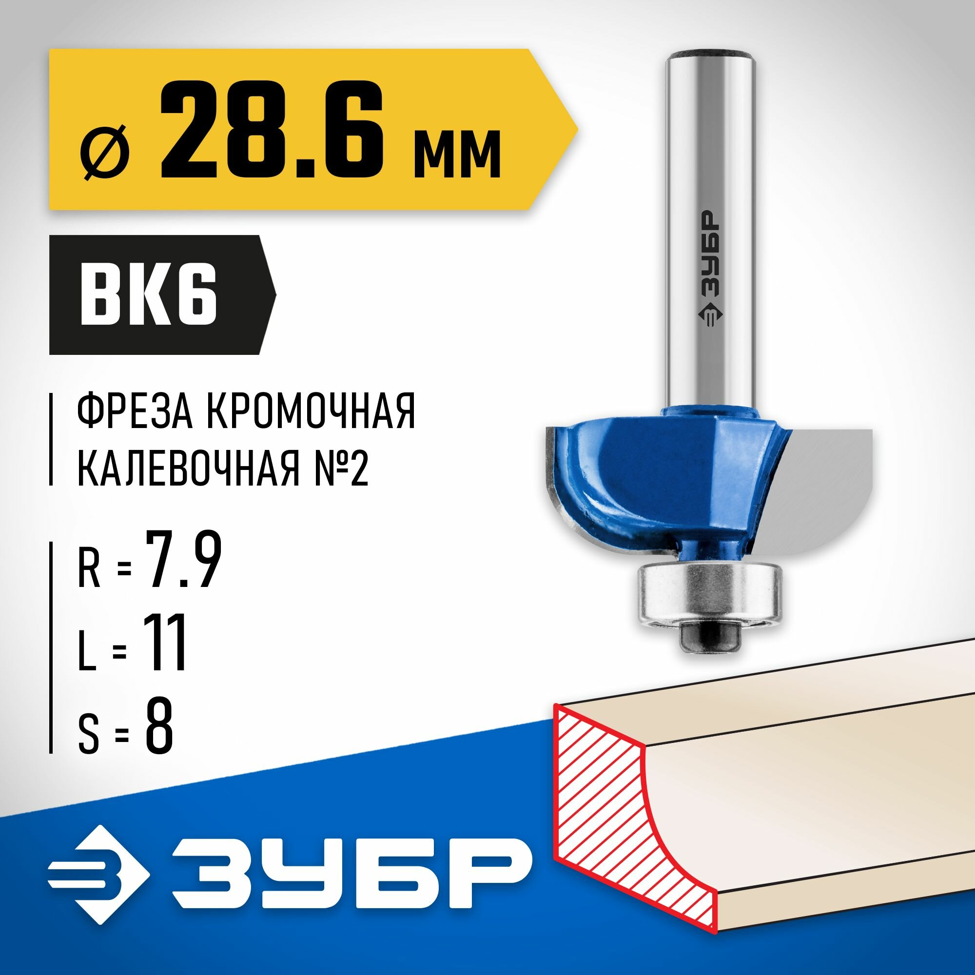 Фреза кромочная калевочная №2, D= 28,6мм, рабочая длина-11мм, радиус-7,9мм, хв.-8мм, d-12,7мм, ЗУБР Профессионал