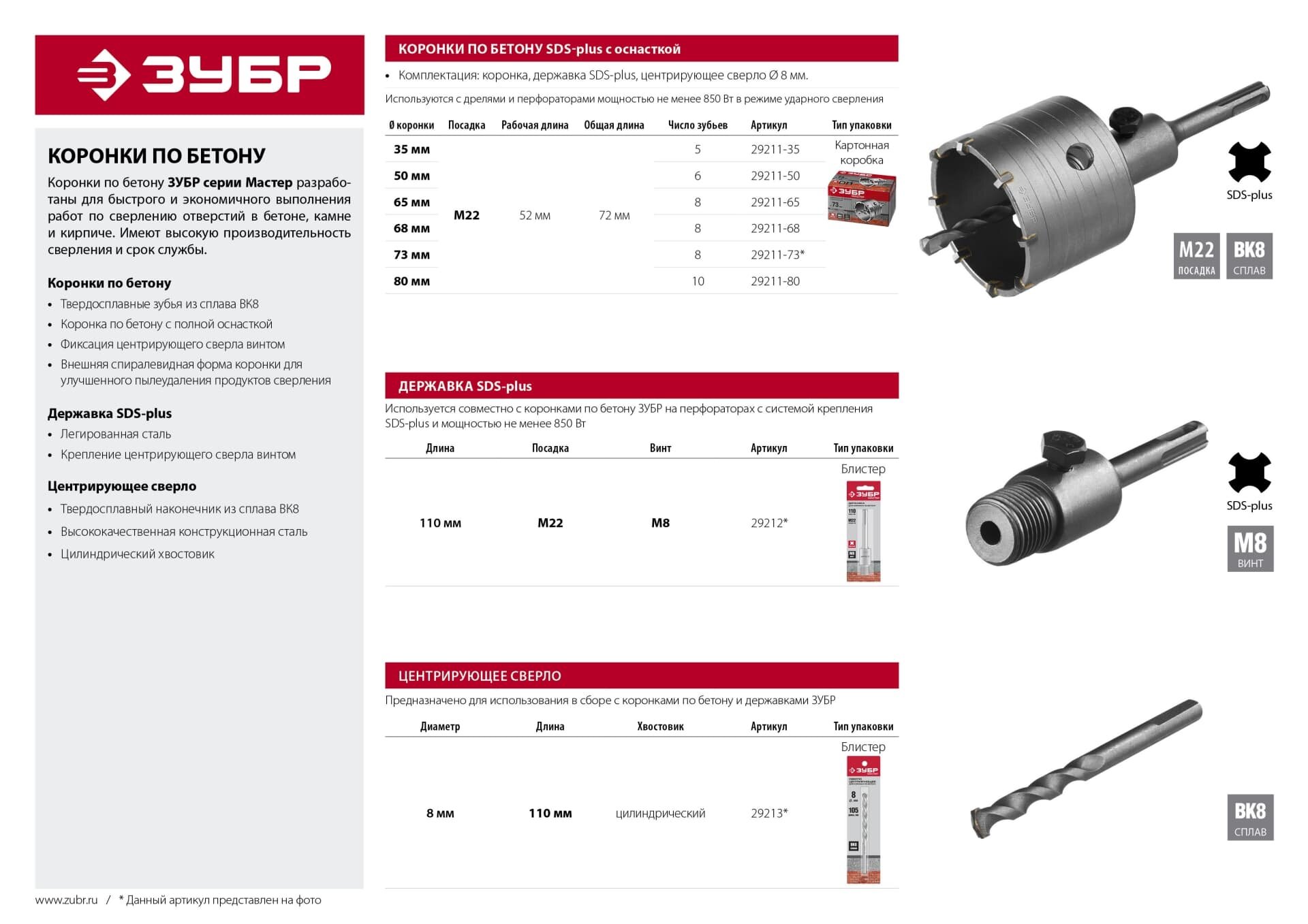 Коронка по бетону с оснасткой Зубр 29211-35 предназначена для сверления отверстий в бетоне, кирпиче, природном и искусственном камне, а также плотных известняках. Используется с дрелями и перфораторами мощностью не менее 850 Вт в режиме ударного сверления. Используются прокладке коммуникаций в строящемся здании. Позволяют без труда получать отверстия среднего или большого диаметра в самых прочных материалах.Преимущества: Твердосплавные зубья из сплава ВК8 позволяют эффективно дробить обрабатываемый материал Специальная спиралевидная форма корпуса коронки из высокопрочной стали уменьшает трение о стенки отверстия, ускоряет отвод шлама и повышает срок службы инструмента Коронка по бетону с полной оснасткой Державка SDS-plus из легированной стали Резьбовая посадка М22 обеспечивает надежное крепление коронки с державкой Фиксация центрирующего сверла винтом Износостойкое покрытие защищает от коррозии