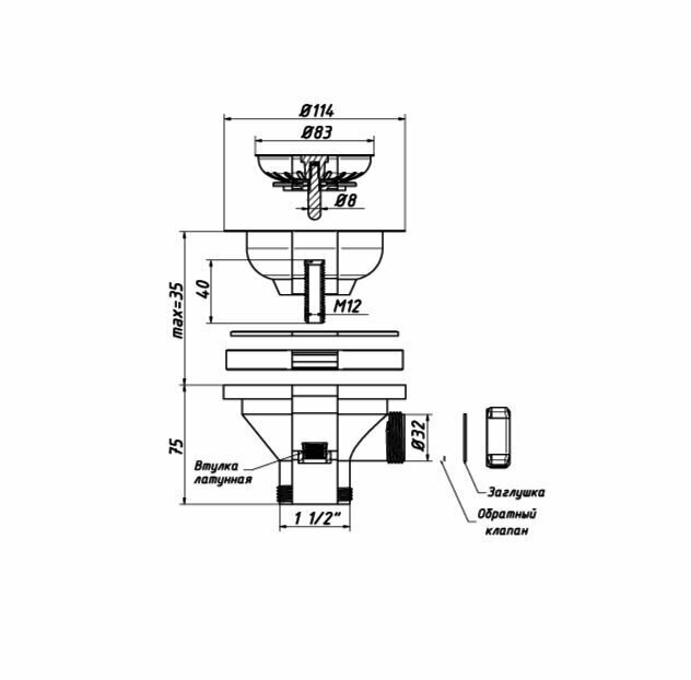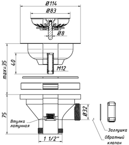 | Комплектация | горловина (с переливом), прокладка горловины, прокладка под нержавеющую чашку (D=114), комплект нержавеющей чашки (с решёткой пробкой и полой втулкой), заглушка, прокладка (с гидрозатвором), гайка |