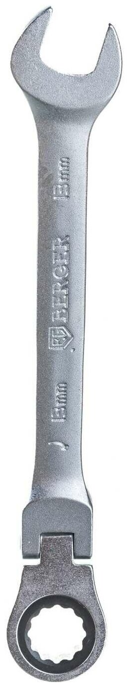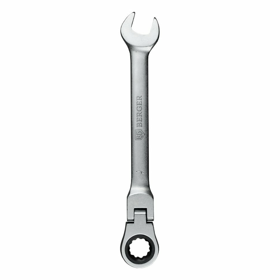 Ключ трещоточный с шарниром BERGER, полностью выполнен из инструментальной хромванадиевой стали, с антикоррозийным покрытием «Satin» (матовый хром). Храповый механизм трещоточных ключей BERGER имеет: 72 зубца, изготовлен из хроммолибдена (Cr-Mo). Работает с болтом и гайкой: M8.Преимущества DIN 899 Сталь: Cr-V Твердость: 44-49 HRC Стальхрапового механизма: Cr-Mo Твердость храпового механизма: 58 HRC Угол наклона рожков 15° Шаг 5° (72 зубца) Шарнир (Ход шарнира 180°)позволяет повысить функциональность ключа при работе в труднодоступных местах Двухсторонняя маркировка ключа облегчает идентификацию