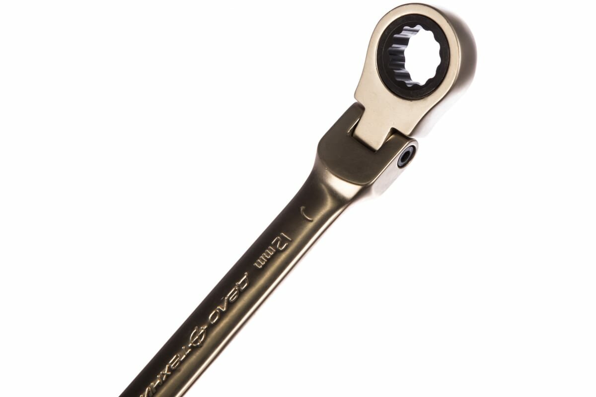 Комбинированный ключ из хромованадиевой стали с надёжным 90-зубцовым храповым механизмом в накидной части, выполненном в виде поворотного шарнира. Шарнирный ключ с трещоткой ускоряет отворачивание и заворачивание крепежа как в обычных условиях, так и в условиях ограниченного пространства. Минимальный угол возврата ключа составляет 4?. Никелирование с защитным лаковым слоем обеспечивает дополнительную антикоррозионную стойкость трещоточного ключа.Трещоточная часть ключа не предназначена для срыва и силовой протяжки крепежа, для этого применяется рожковый профиль ключа или торцевые головки.Размер: 12 мм Длина: 165 ммСталь: 6140CrVТвёрдость: 44—48 HRCНикелирование