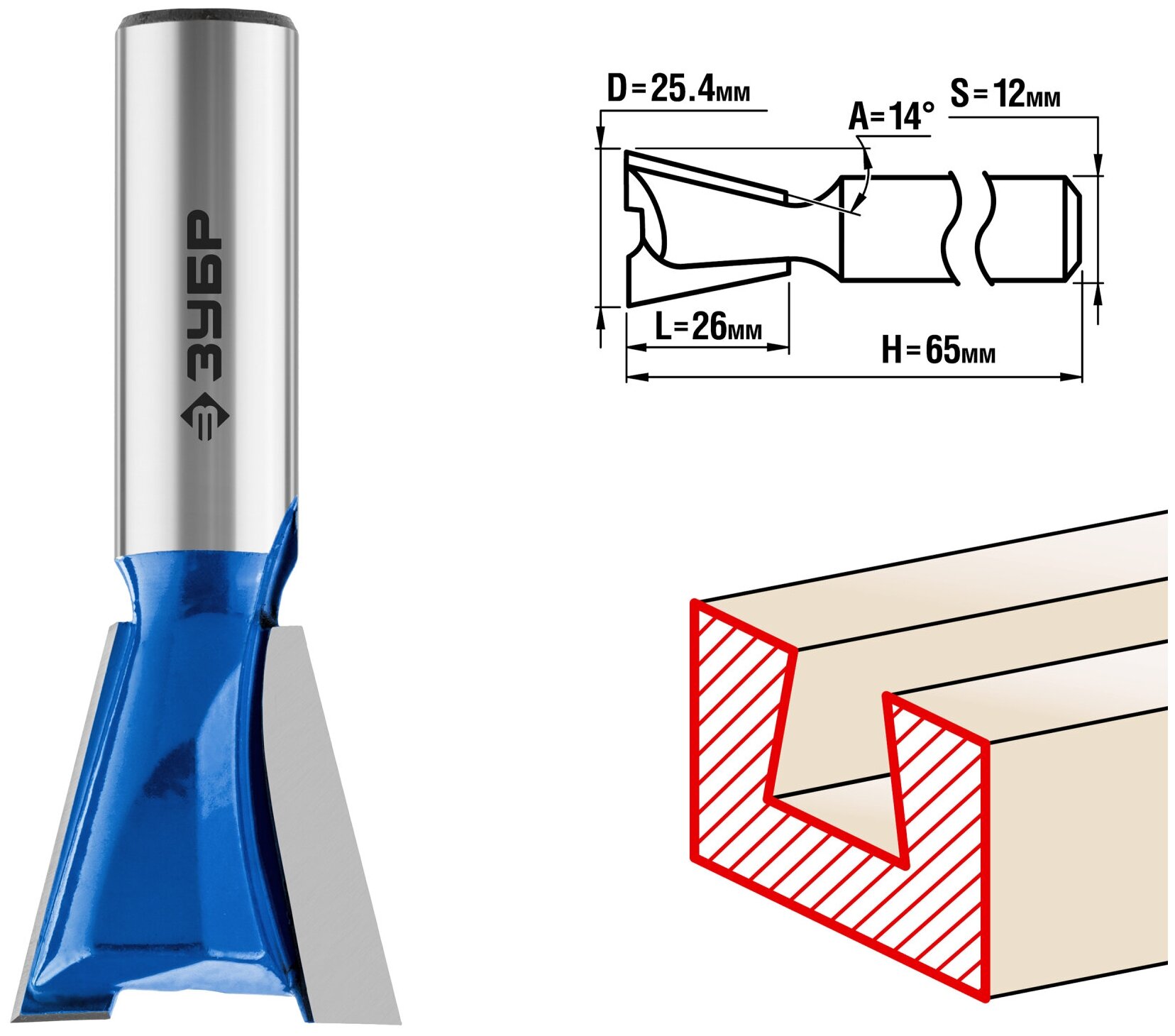 Фреза пазовая фасонная "Ласточкин Хвост", D= 25,4мм, рабочая длина-26мм, обратный угол-14 градусов, хв.-12 мм, ЗУБР Профессионал
