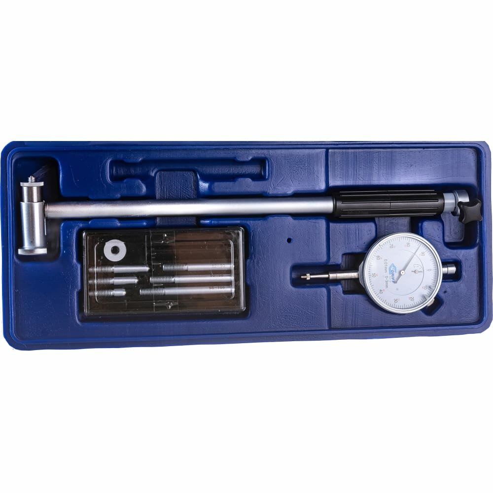 Предназначен для измерения внутренних размеров изделий двухточечным контактом с измеряемыми поверхностями относительным методом. Отсчетное устройство - индикатор часового типа. Диапазон измерений 50.100 мм. Цена деления 0,01 мм. Наибольшая глубина измерения 200мм. Производство Guilin Measuring & Cutting Tool Co, Ltd.