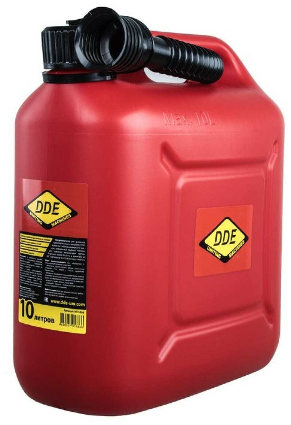 Канистра для ГСМ, 10 л DDE предназначена для хранения, транспортировки и заправки двигателей ГСМ. Канистра снабжена винтовой крышкой с замком - защита от вскрытия детьми; заправочной трубкой с системой выравнивания давления; петлями для хранения заправочной трубки.Преимущества Разрешен залив бензина в канистру на АЗС Гибкая заправочная трубка облегчает залив и уменьшает риск расплёскивания топлива при заправке техники Изготовлена из полиэтилена высокой плотности с антистатическими добавками - масло-бензостойкий пластик