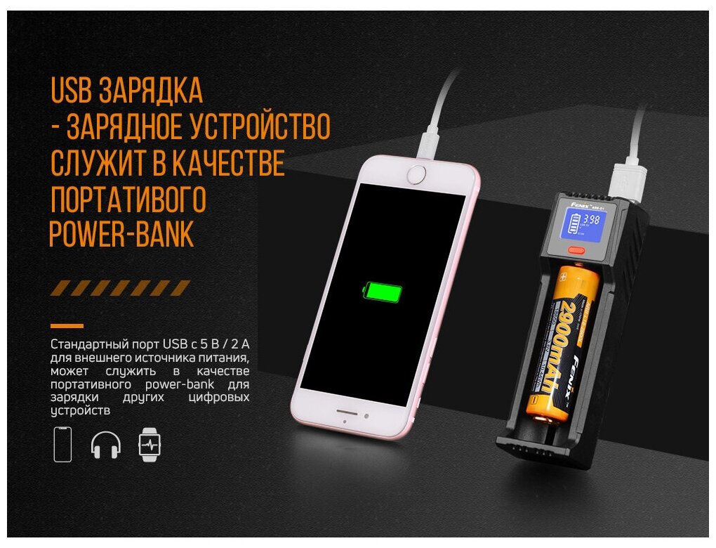 Модель Fenix предназначена для зарядки всего одного аккумулятора. Это компактное устройство совместимо с целой линейкой популярных типов перезаряжаемых элементов питания. Оно подойдет для использования дома или любых путешествий.