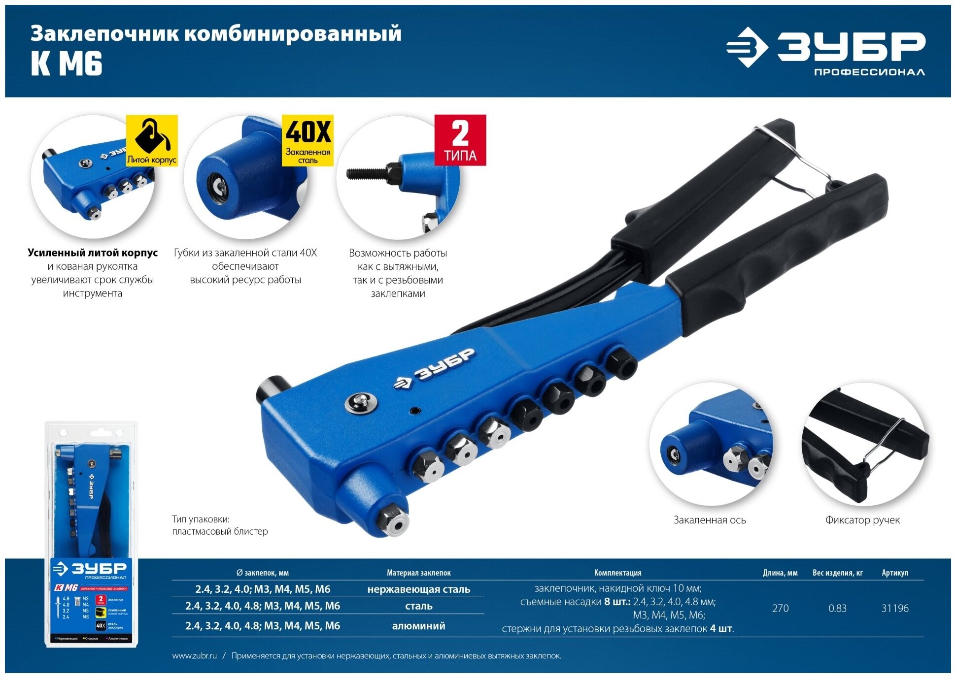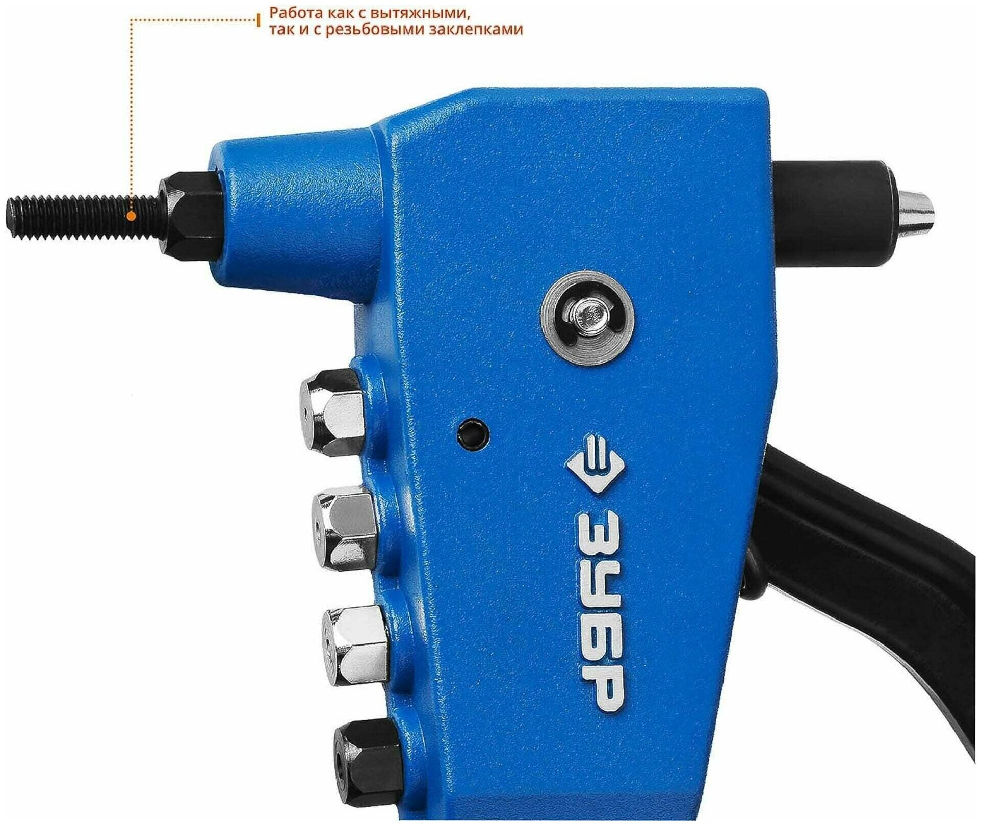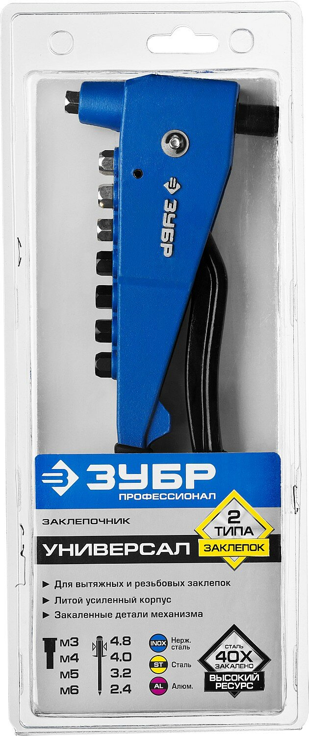 Заклепочник ЗУБР 31196_z01, предназначен для работы с резьбовыми и вытяжными заклепками из нержавеющей стали, стали и алюминия. Усиленный литой корпус и кованая рукоятка увеличивают срок службы инструмента.